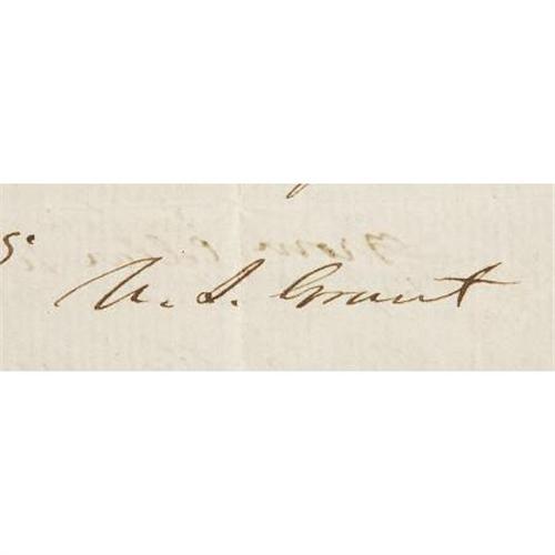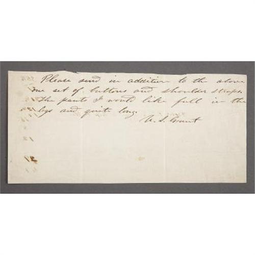 <B>GEN. U.S. GRANT AUTOGRAPH DOCUMENT SIGNED, REQUEST FOR BRIGADIER GENERAL UNIFORM.</B></I> Grant was an American general and the eighteenth president of the United States (1869-1877). He achieved international fame as the leading Union general in the American Civil War, capturing Vicksburg in 1863 and Richmond in 1865. He accepted the surrender of his Confederate opponent Robert E. Lee at Appomattox Court House. <B>General Ulysses S. Grant</B></I> document signed “<I>U. S. Grant</B></I>”. One page, 8” x 3.75”, document Grant orders his first brigadier general's uniform from Brooks Brothers (included in accompanying provenance). “<I>Please send in addition to the above one set of buttons and shoulder straps. The pants I would like full in the legs and quite long. Signed U. S. Grant</B></I>." Great historical content document. Verso of this document: <BR><BR><I>Round the breast under coat 35½<BR>Round the waist under coat 31<BR>From middle back seam to elbow 20½<BR>From elbow to wrist for length of sleeve 12½<BR>From collar seam to hip buttons 19<BR>Hip buttons to button of shirt for length of coat 16<BR>Round the wrist 8<BR>Round the elbow 12<BR><BR>For pants<BR>Round the waist 29<BR>From top of waistband to bottom outside 49</B></I><BR><BR><B>Condition:</B></I> Very fine.<BR><BR><b>Shipping:</b> Miscellaneous Collectibles, Smal (<a target="_blank" href="http://www.heritageauctions.com/common/shipping.php">view shipping information</a>)