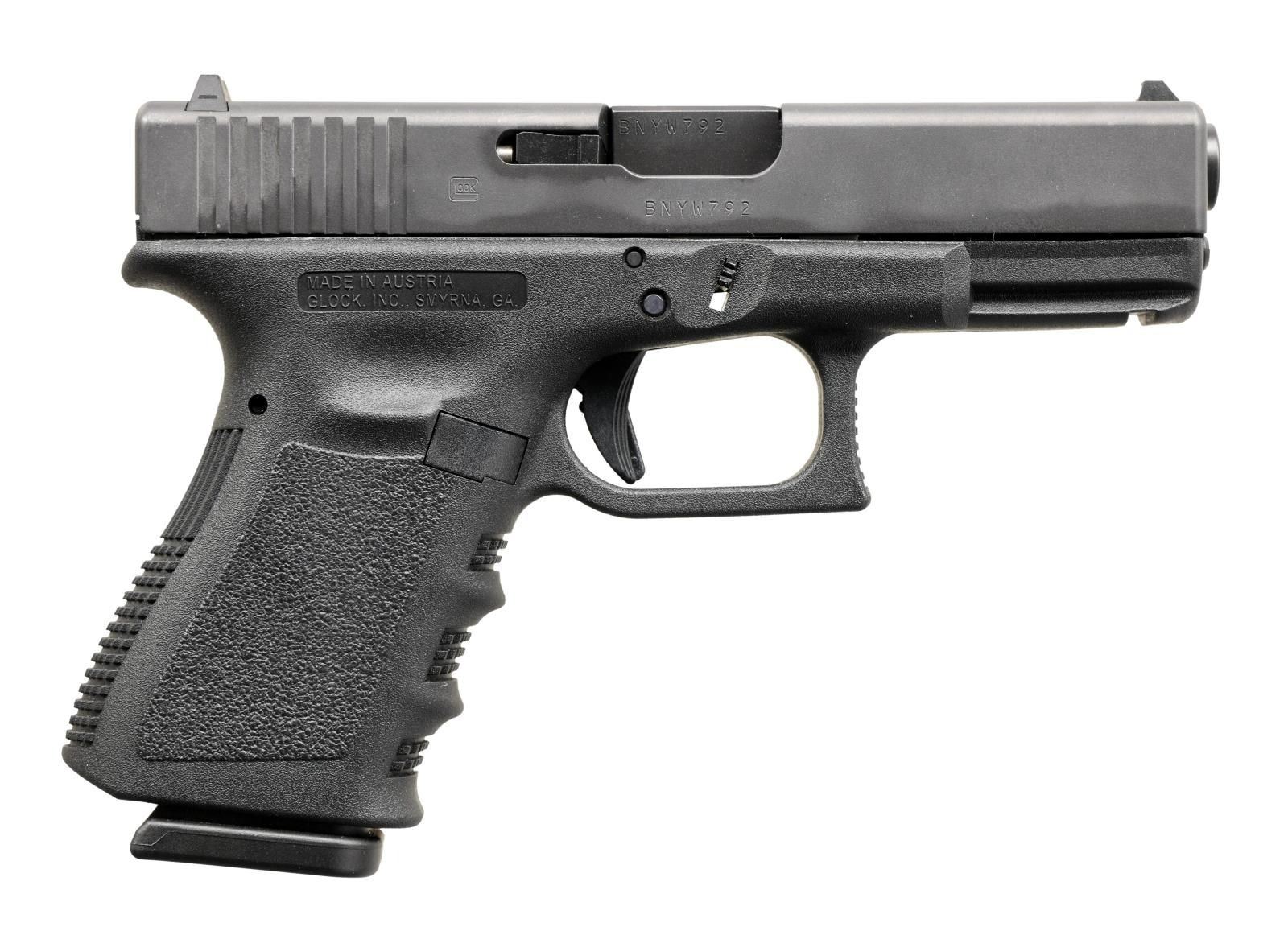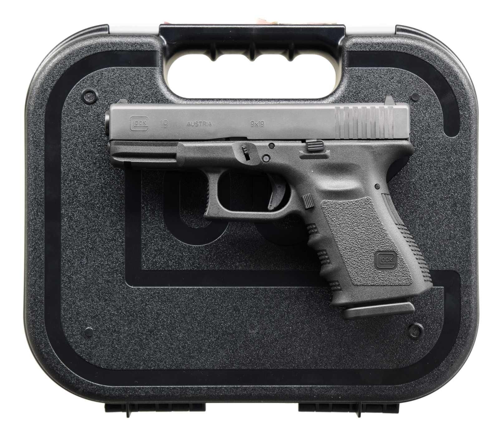 Cal. 9mm Luger. S# BNYW792. Bbl. 4". Standard white outline Glock sights. Austrian Gen 3 Glock 19 pistol. Matte black finish. Polymer frame with accessory rail. MAGS: two 15 rd. UNATTACHED ACCESSORIES: matching numbered factory hardcase with manual, cleaning rod, mag-loader, and cable lock. CONDITION: all aspects are near excellent. PROVENANCE: from the collection of Gun Sport Ltd., owned by Jon R. Thomas. (23-4141/MJC). MODERN. $350-500.