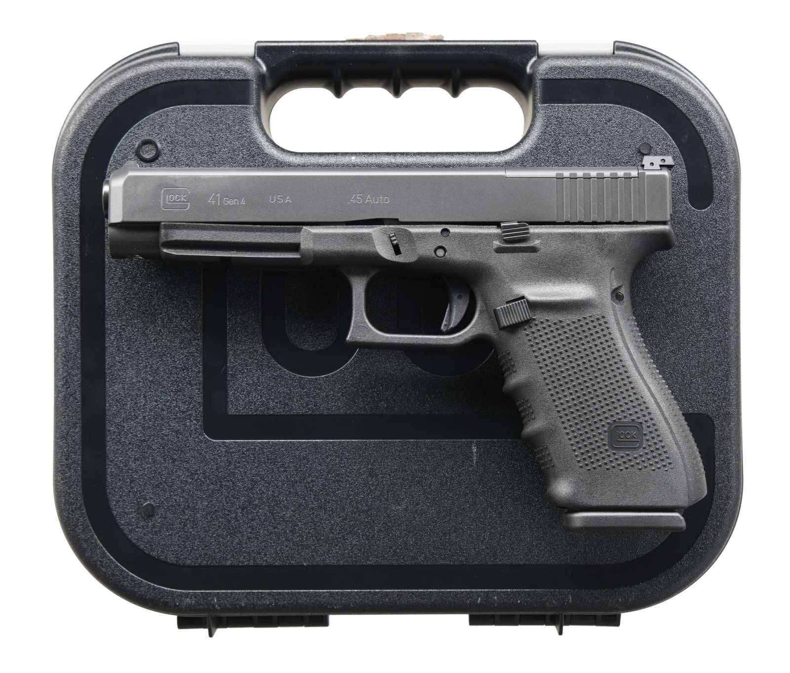 Cal. 45 ACP. S# AGGF845. Bbl. 5 1/3". Standard white outline Glock sights w/ adjustable rear. Slide has cut for RMR for reflex sight mounting. USA made Glock 41 Gen 4 pistol. Matte black finish. Polymer frame w/ accessory rail. MAGS: 3-13 rd. UNATTACHED ACCESSORIES: matching numbered factory hardcase w/ MOS adapter kit, two spare backstraps, cable lock, manual, cleaning rod, & bore brush. CONDITION: all aspects near excellent. PROVENANCE: the Collection of Gun Sport Ltd owned by Jon R. Thomas. (23-3131/MJC). MODERN. $350-500.