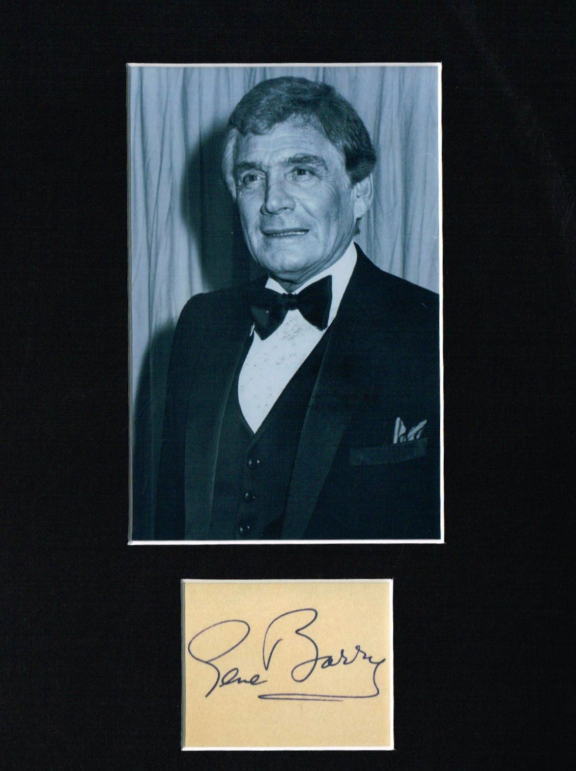 A signed autographed page by Gene Barry. Professionally mounted and framed. He's best known for the films ' The Atomic City and The War of The Worlds'.