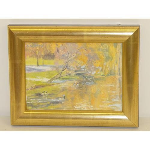 GENE PALETTA OIL ON ARTISTS BOARD OF SWIMMING DUCKS TITLED ON BACK "MALLARD POND"-DONE IN CHAGRIN FALLS OH W/ ARTIST INFO, SUN KING STUDIO-CHESTER VT, PTG. #262 & DATED 1993 ALSO ON BACK, SIGNED ON TOP LEFT IN A GILT FRAME (5" X 7") - NORMAL WEAR