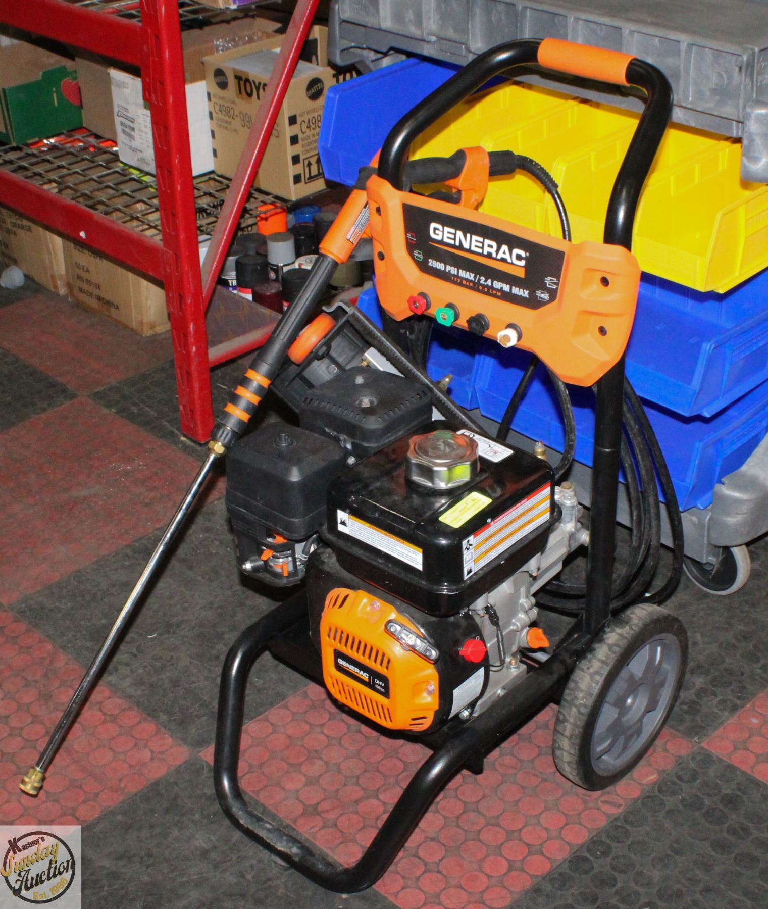 GENERAC 2500 PSI MAX PRESSURE WASHER**ALL ITEMS MUST BE REMOVED BY 5PM SATURDAY, JULY 19TH 2025. ALL REMAINING ITEMS WILL BE SUBJECT TO A $6.00 PER DAY STORAGE CHARGE. ANY ITEMS REMAINING AFTER MONDAY, AUGUST 4TH, 2025 WILL BE CONSIDERED FORFEITED. NO REFUNDS WILL BE ISSUED FOR FORFEITED ITEMS. TO SCHEDULE A PICK UP APPOINTMENT CLICK HERE