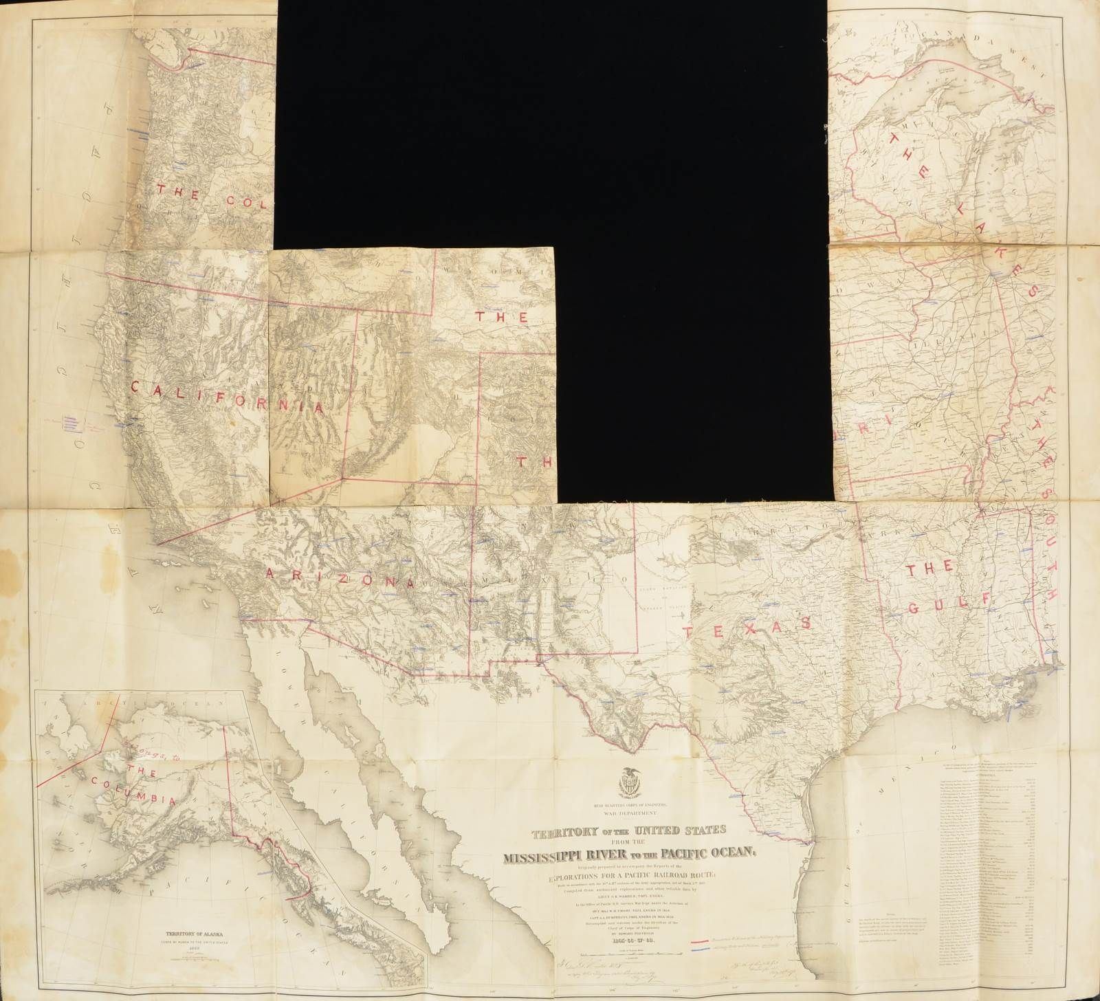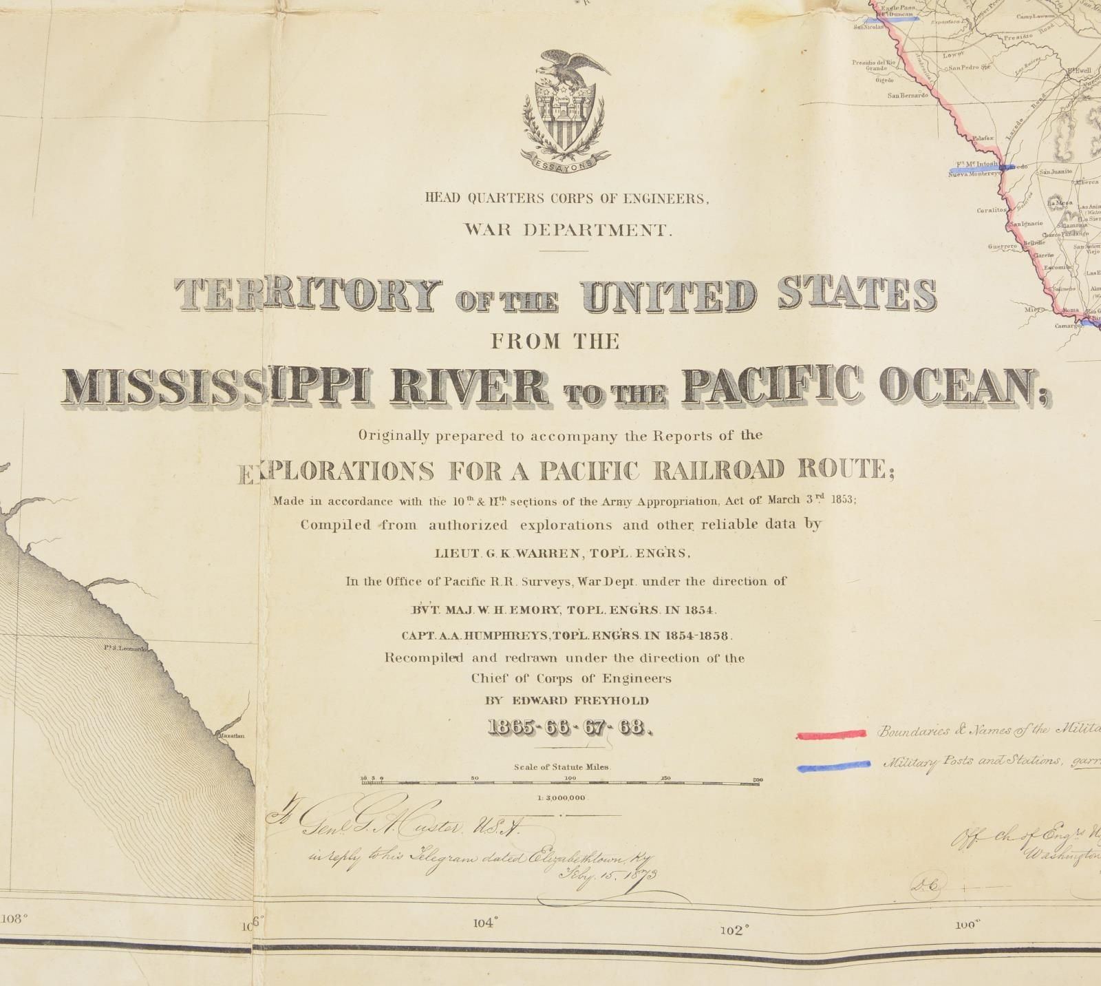 STATES USED IN HIS 1873 SURVEY OF NORTH PACIFIC RAIL ROAD ROUTE THROUGH HOSTILE SIOUX TERRITORY. Ink inscription: "TO GENERAL G. A. CUSTER USA IN REPLY TO HIS TELEGRAM DATED ELIZABETHTOWN, KY FEBY 15 1873", & "OFF. CH. OF ENGRS USA / WASHINGTON DC / FEBY 26 1873". Map is paper panels glued to cloth for easy use in field. It measures 49" x 45" in 16 sections, it is unfortunately missing 3 sections which included the Dakotas and most important area of operation of Custer. Map is further annotated with red & blue highlighted "BOUNDARIES AND NAMES OF THE MILITARY DEPARTMENTS". These are bordered and written in red: "ARIZONA", "TEXAS", "THE GULF" on large lower half and and partial inscriptions on the other three upper sections: "CALIFORNIA", and portions of what is missing "THE COL[ORADO]", "THE[DAKOTAS]". The two upper northeastern sections of map show "THE LAKES" and completing bottom section "THE SOUTH". Topography also highlighted in blue "MILITARY POSTS AND STATIONS, GARRISONED (AS FAR AS OUR INFORMATION EXTENDS)". The map has newer forts added as several had been established since publication in 1868. Written in red ink with blue underline: "FT BLISS", "CAMP CRITTENDEN", "CAMP CH'S", "CAMP VERDE", "CAMP APACHE", "CAMP TULERASA", "FT WINGATE" noting old "FT VINGATE", "ALCATRAZ" in San Francisco Bay. Custer had just been ordered to reunite the 7th cavalry stationed at various posts. Custer's command would take 3 steamboats up the Mississippi in Memphis to start their journey that this map would be used. By late September 1873 Custer and his command were stationed at Ft. Abraham Lincoln. This map appears to be shown framed on floor in his study in photo taken by Orlando Goff, November 1873. The missing pieces are not known if in possession of other family members or lost in the field. CONDITION: good to very good overall for the 13 of 16 pieces remaining present, staining and soiling as expected with field use. All inked & printed text is very good. PROVENANCE: Direct descent from descendants of James Calhoun Custer; Martin Lane Historic & Western Americana Lifetime Collection. (02-21442-5/JS). $5,000-10,000.