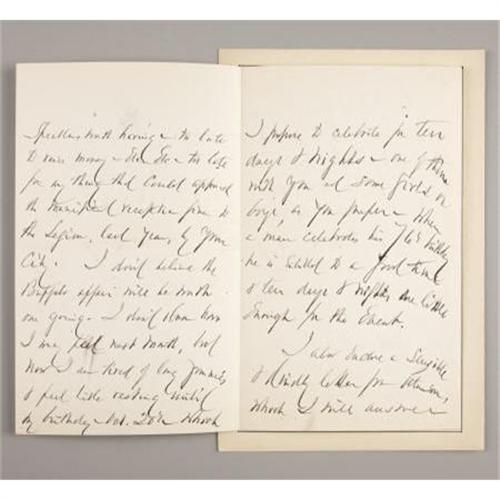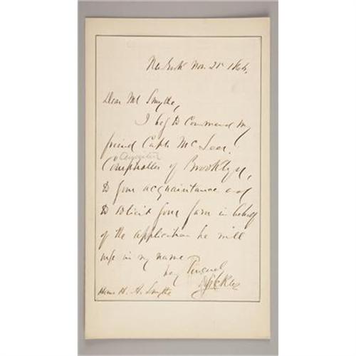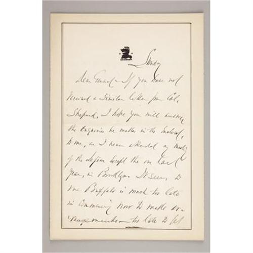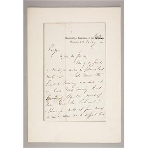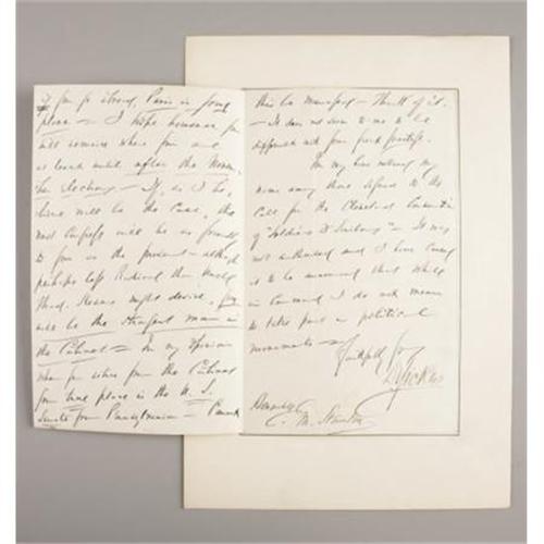 <B>GENERAL DANIEL E. SICKLES: LOT OF FOUR AUTOGRAPH LETTERS SIGNED, 1864-1866.</B></I> Sickles (October 20, 1819 - May 3, 1914) was a colorful and controversial American politician, Union general in the American Civil War, and diplomat. This lot has four letters signed by General Sickles; two with <I>“D. Sickles”</B></I> bold signatures, and two with <I>“D. S.”</B></I> signature. All letters are mounted on cards, three are 6” x 8.75” and one 7.50” x 11.25”. <B>First letter:</B></I> New York Nov. 21 1864. <I>“Dear Mr. Smythe, I beg to command my friend Capt. McLeer, comptroller of Brooklyn, to your acquaintance and to solicit your favor in behalf of the application he will use in my name Very Sincerely, D. Sickles.”</B></I> <B>Second</B></I> <B>letter</B></I>: Headquarters, Department of the South Charleston, S. C. 26 Aug. 1866. <I>n part <I>“Private, My Dear Mr. Stanton, One of my friends in Washington writes as follows last week - Col. Morrow the presidents Secretary remarked at our house last evening that Secretary Stanton would soon leave the Cabinet”. </B></I> Etc. faithfully yours, D. Sickles. <B>Third letter:</B></I> Sunday (New York) <I>n part “Dear General if you have not received a similar letter from Col. Shepard, I hope you will answer the enquires he makes in the enclosed… feel like resting until my birthday - Oct 20th which I propose to celebrate for ten days and nights.. when a man celebrates his 76th birthday he is entitled to a good time & ten days & nights are little enough for the Event.” Etc. Yours D. S<B>. Fourth letter: </B></I>Friday 23 Fifth Avenue. (New York) in part <I>“Dear general - here I am at home again - arrived this morning and found your letters. Enclosed private cheque</B></I> <I>for M. & S. bill $27.00. I attended the funeral services at the “Wilson” residence - Roosevelt treated me with conspicuous attention - root also Spoke at the G. A. R. memorial service in the “Music temple” - the exhibits grand great audience - speech very well received”</B></I>. Etc. Yours truly D. S. <BR><BR><B>Condition:</B></I> All four letters are in fine condition. <BR><BR><b>Shipping:</b> Flat Material, Small (<a target="_blank" href="http://www.heritageauctions.com/common/shipping.php">view shipping information</a>)