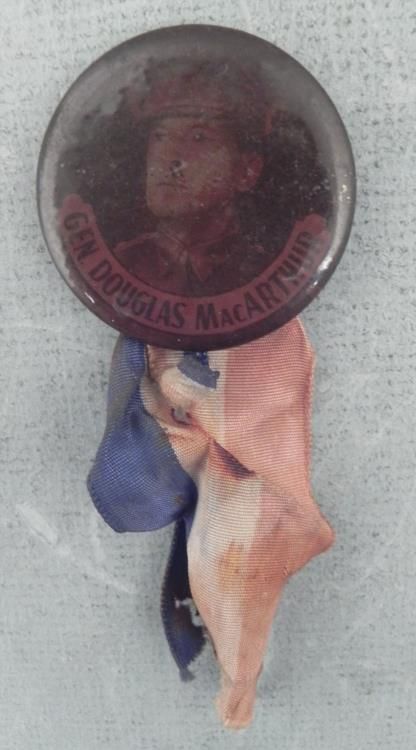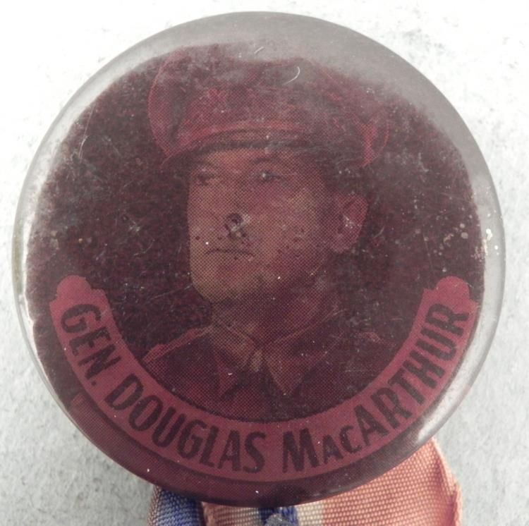 GENERAL DOUGLAS McARTHUR PICTURE BUTTON & RIBBON-ORIG1 3/4" DIAM
