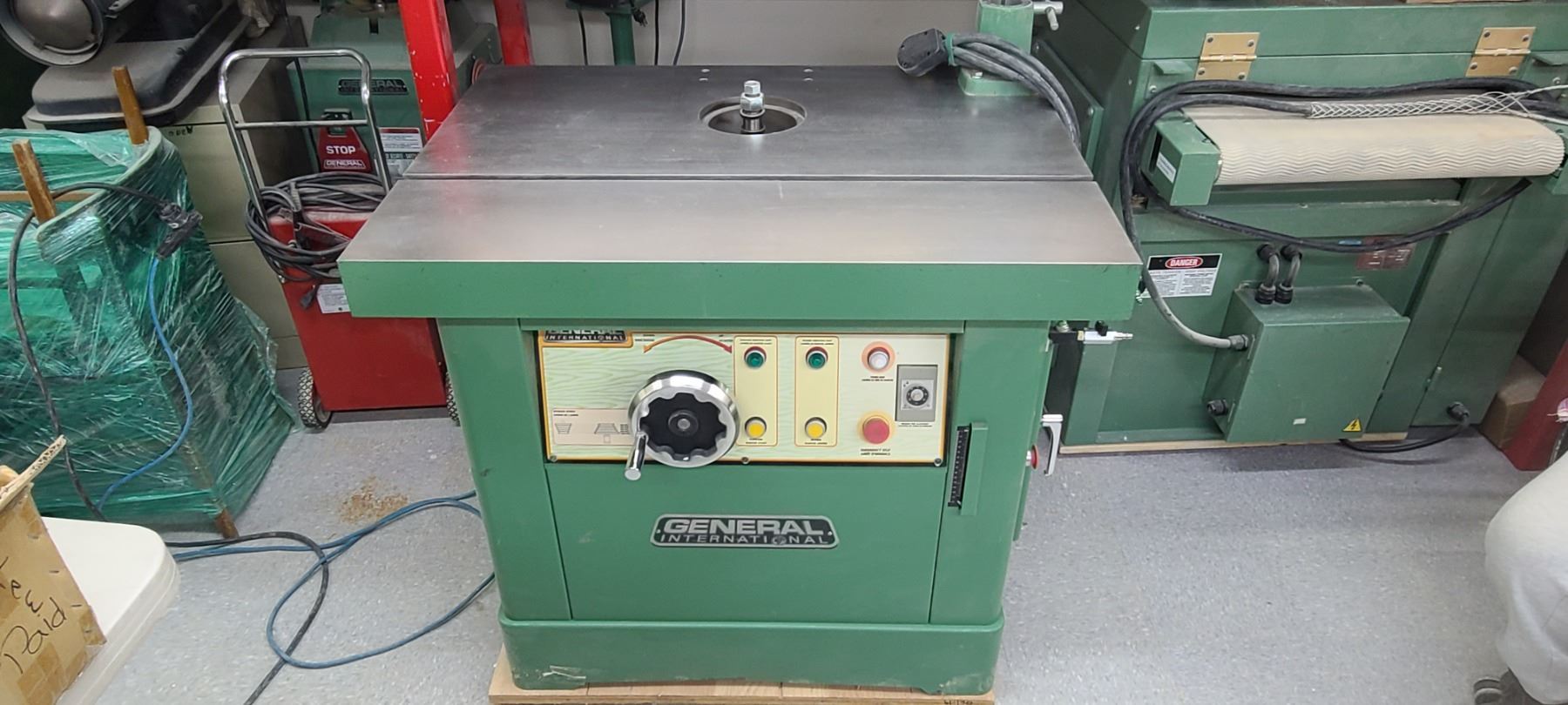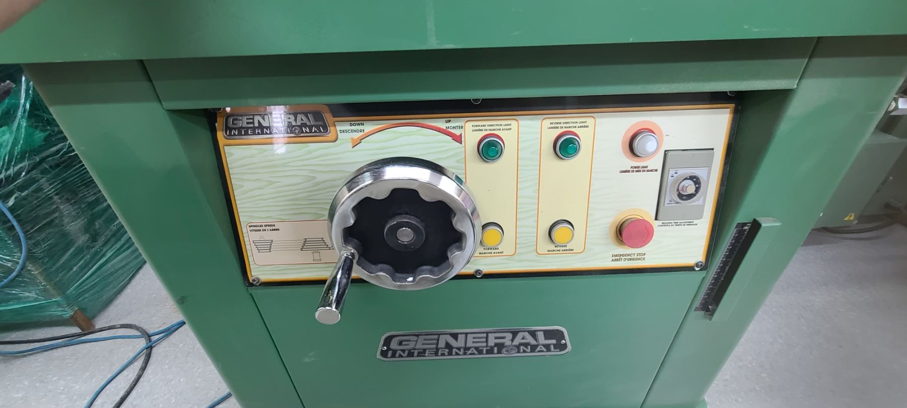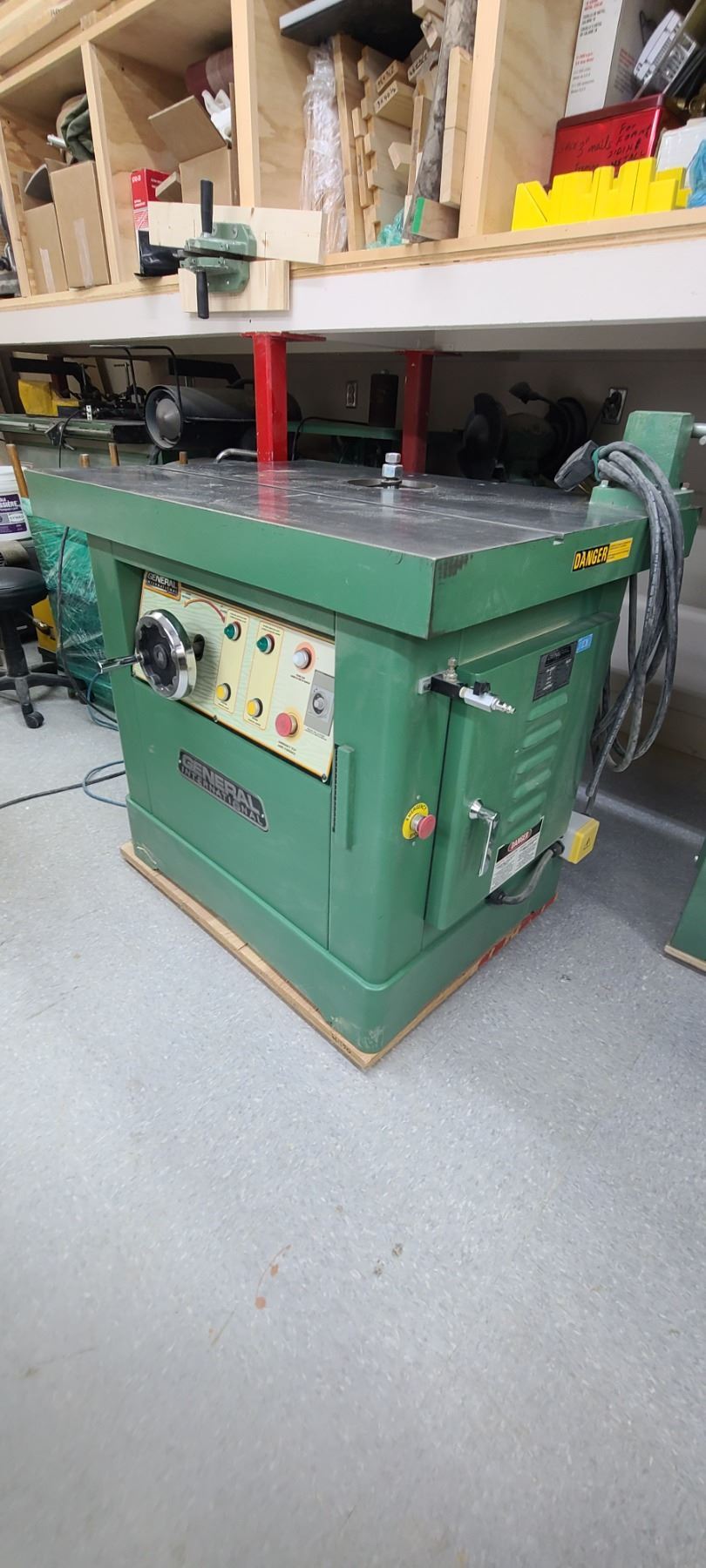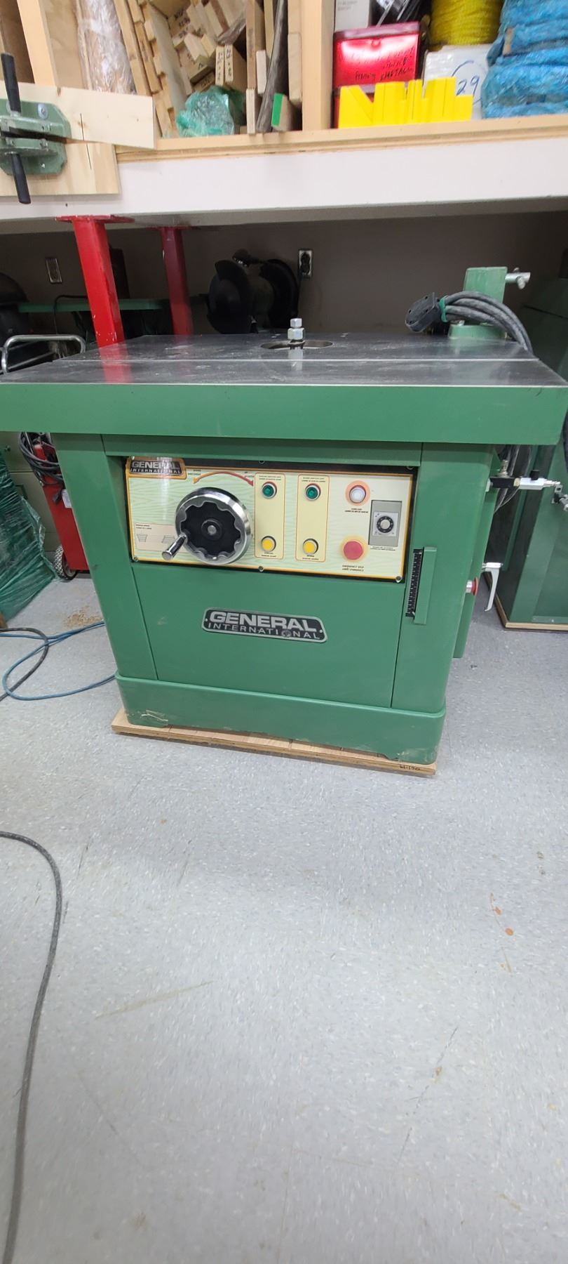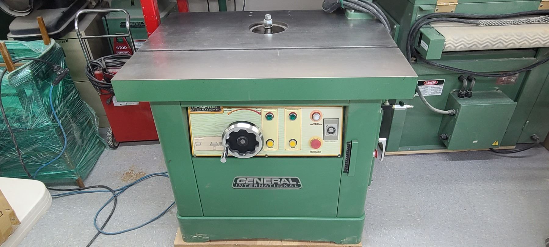 GENERAL INTERNATIONAL 1 1/4" WOOD SPINDLE SHAPER MODEL 40-450 - SINGLE PHASE- 220V - ACCESSORIES TO THIS ARE LOTTED IN LOT 222 TO 223 SOLD SEPERATELY