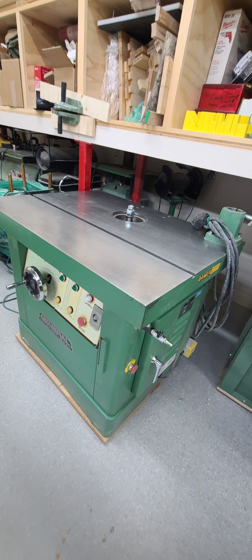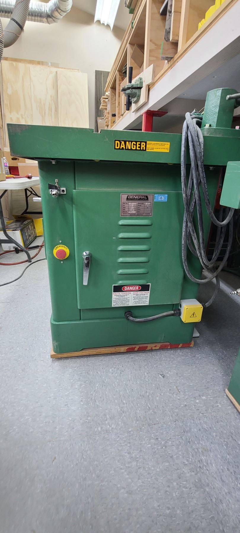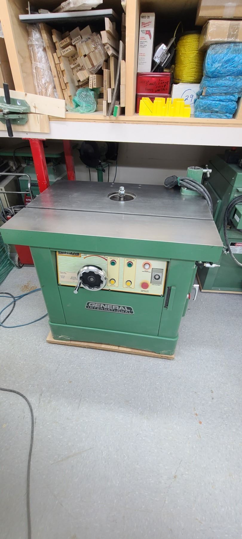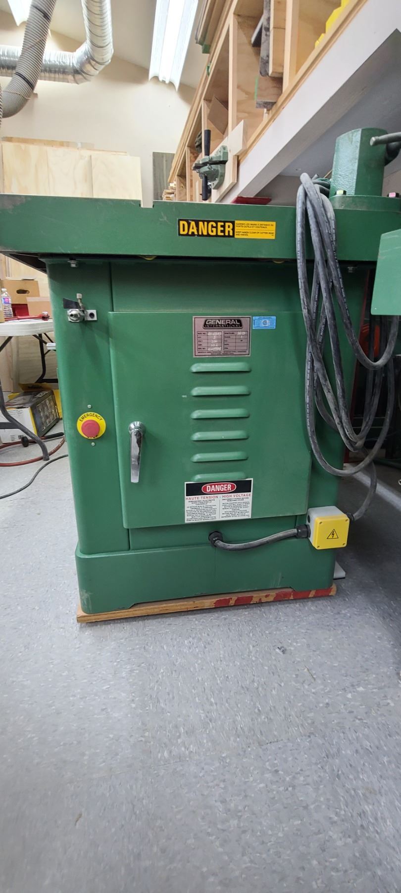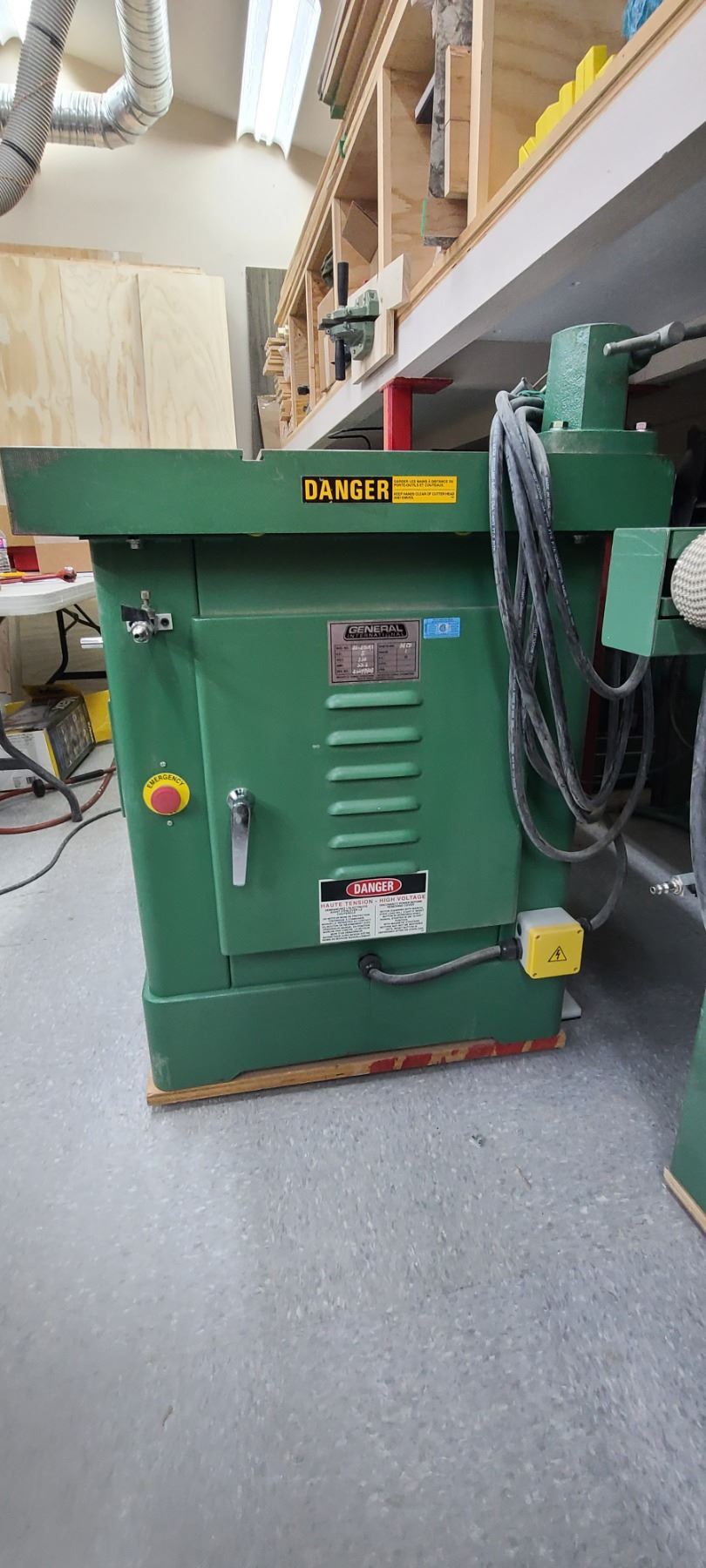 GENERAL INTERNATIONAL 1 1/4" WOOD SPINDLE SHAPER MODEL 40-450 - SINGLE PHASE- 220V - ACCESSORIES TO THIS ARE LOTTED IN LOT 222 TO 223 SOLD SEPERATELY