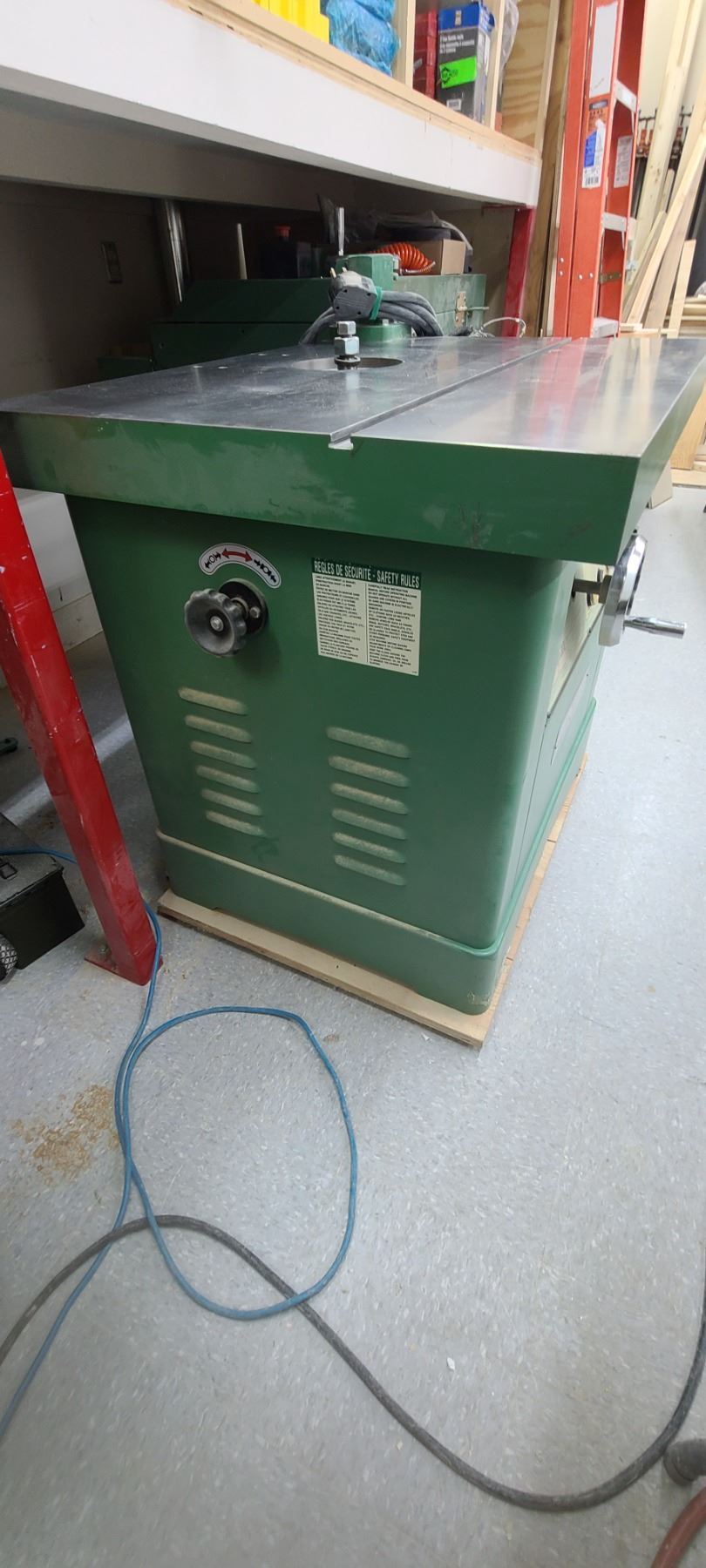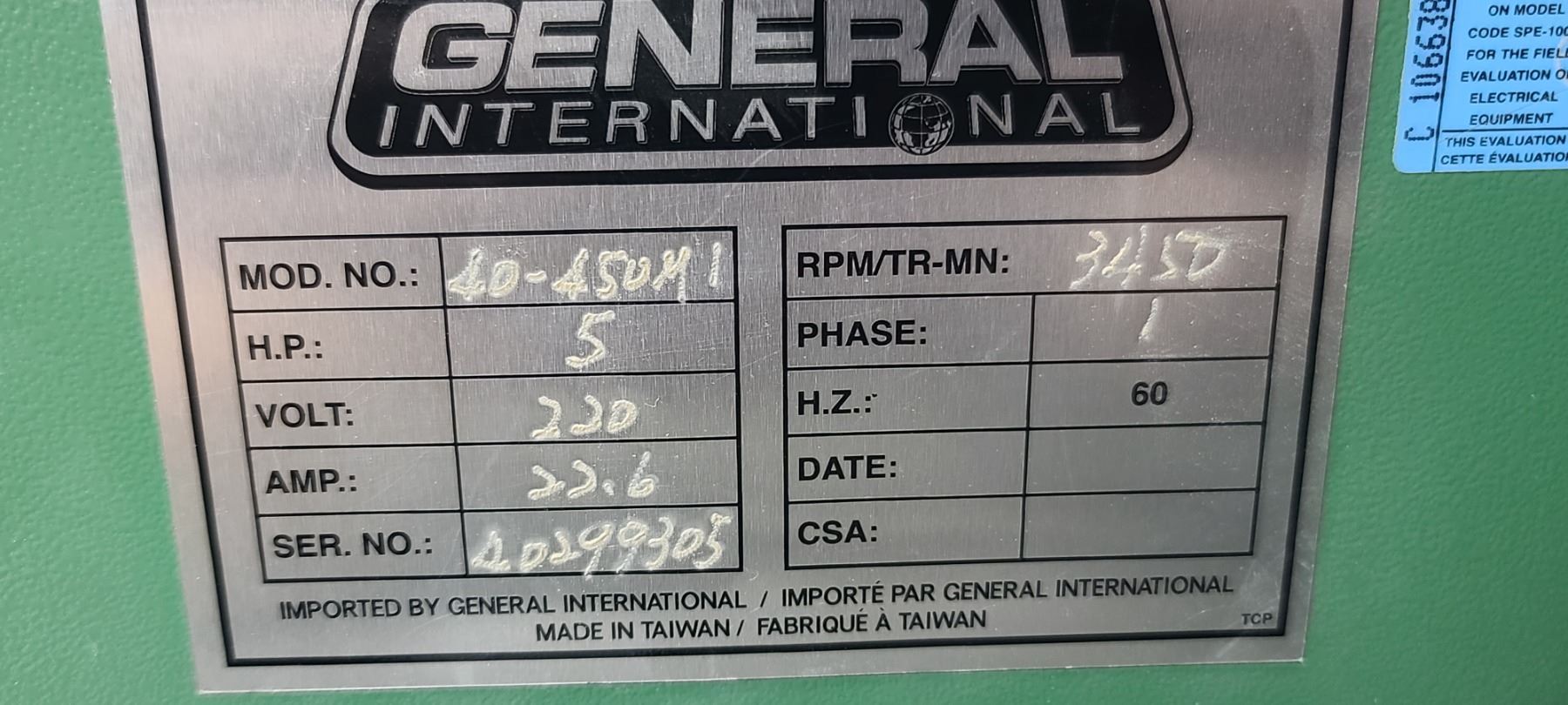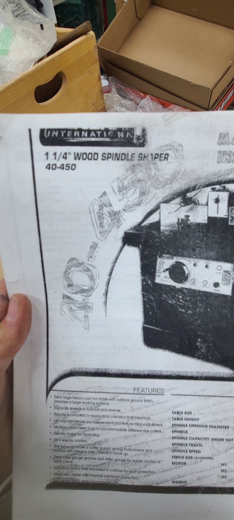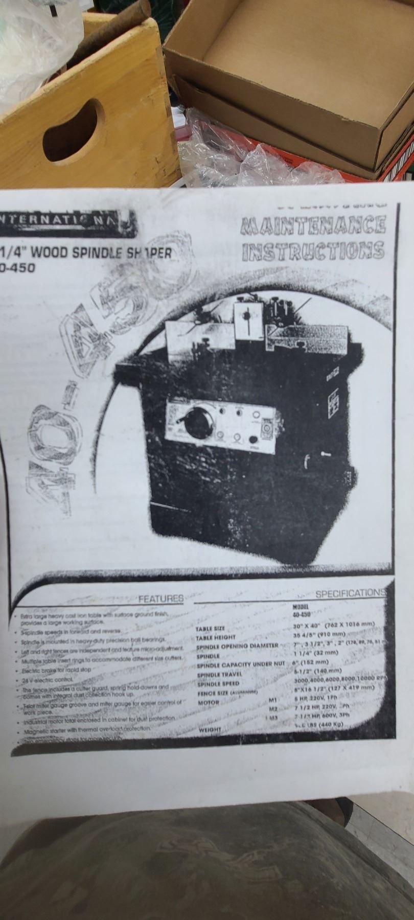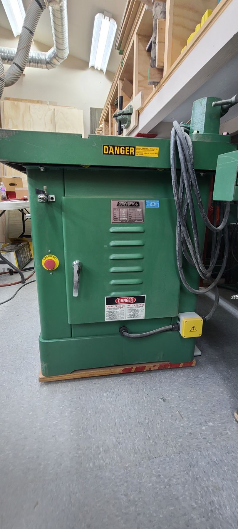 GENERAL INTERNATIONAL 1 1/4" WOOD SPINDLE SHAPER MODEL 40-450 - SINGLE PHASE- 220V - ACCESSORIES TO THIS ARE LOTTED IN LOT 222 TO 223 SOLD SEPERATELY