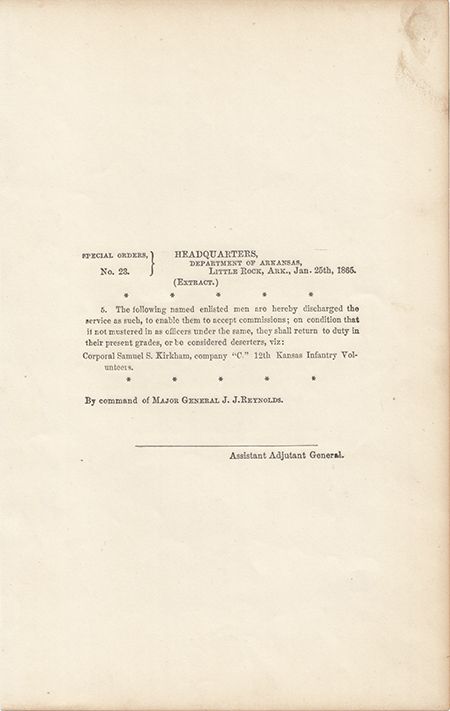 Rare imprint "Special Orders No. 23 Headquarters, Department of Arkansas, Little Rock, Ark. Jan. 25th, 1865", signed in type by Maj. General John J. Reynolds, discharge of a man in order that he may accept a commission. Soiled at upper-right, else very good. According to the Hendershott listing included, this general order, from the14th Kansas occupation of Little Rock, is one of only two known.