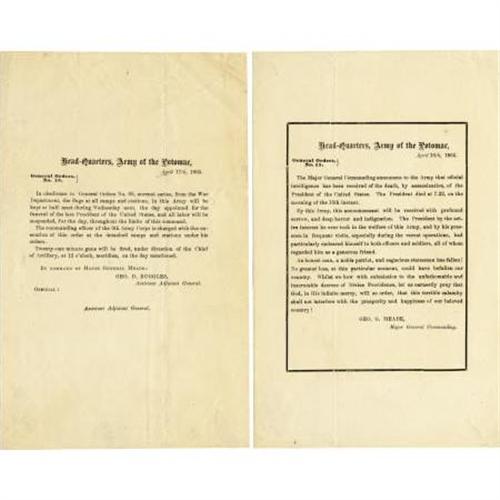 <B>LOT OF TWO GENERAL ORDERS 15 & 16 ANNOUNCING PERIOD OF MOURNING FOR PRESIDENT LINCOLN, 1865.</B></I> Headquarters, Army of the Potomac, April 16th, 1865 General Orders, No. 15, in part: <I>"The Major General Commanding announces to the Army that official intelligence has been received of the death, by assassination of the President of the United States. The President died at 7.22, on the morning of the 15th instant."</B></I><BR> <BR>Headquarters, Army of the Potomac, April 17th, 1865 General Orders, No. 16, iIn part: "In obedience to General Orders No. 69, current series, from the War Department, the flags at all camps and stations, in this Army will be kept at half mast during Wednesday next, the day appointed for the funeral of the late President of the United States, and all labor will be suspended, for the day, throughout the limits of this command." Each 5” x 8”. <BR><BR><B>Provenance: </B></I><I>Al. Emmett Fostell Collection</B></I><B><I> </B></I></B></I><BR><BR><B>Condition:</B></I> Very fine.<BR><BR><b>Shipping:</b> Miscellaneous Collectibles, Smal (<a target="_blank" href="http://www.heritageauctions.com/common/shipping.php">view shipping information</a>)