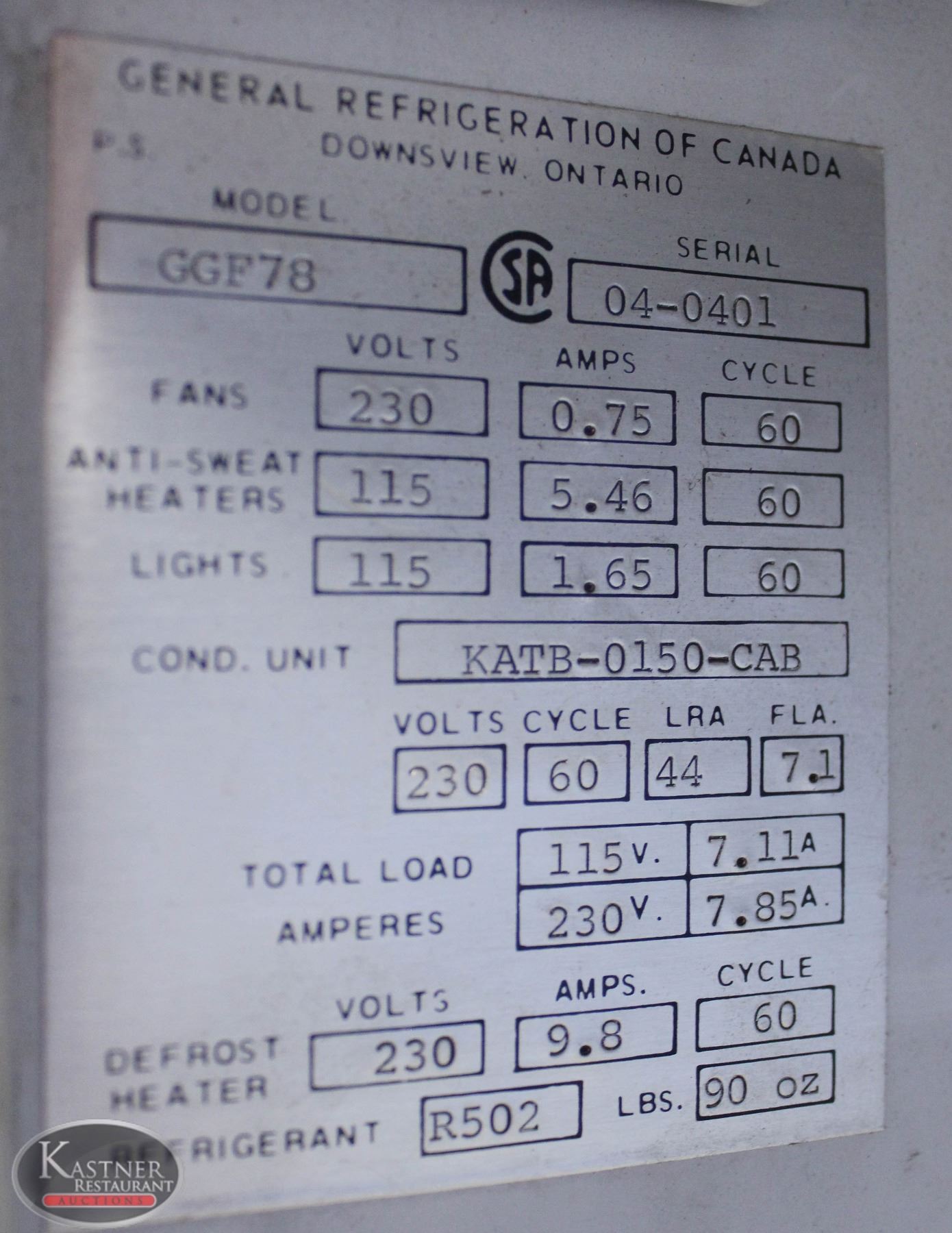 GENERAL REFRIGERATION 3 DOOR COOLER. COMES WITH 9 SHELVES. 82"X30"X77". MODEL#GGF78, FANS: 230V, 0.75 AMP, CYCLE 60. ANTI SWEAT HEATERS: 115V, 5.46 AMP, CYCLE 60. LIGHTS: 115V, 1.65 AMP, CYCLE 60. CONDITIONING UNIT: MODEL# KATB-0150-CAB, 230V, **RIGHT DOOR IS CRACKED SOLD AS IS NO RECONSIGNMENT **
