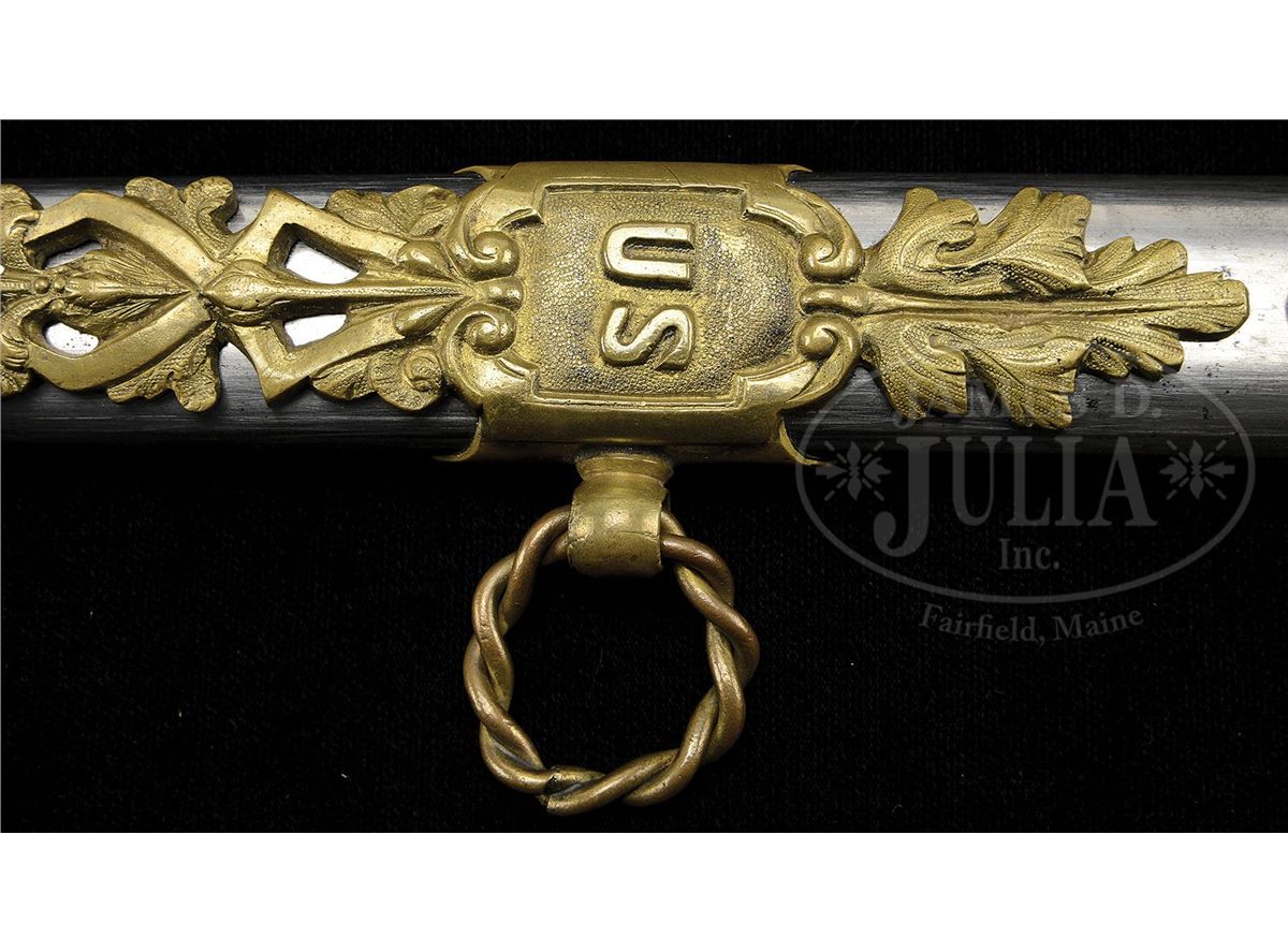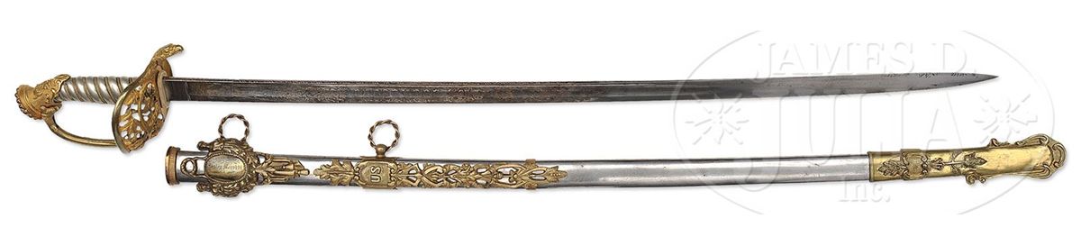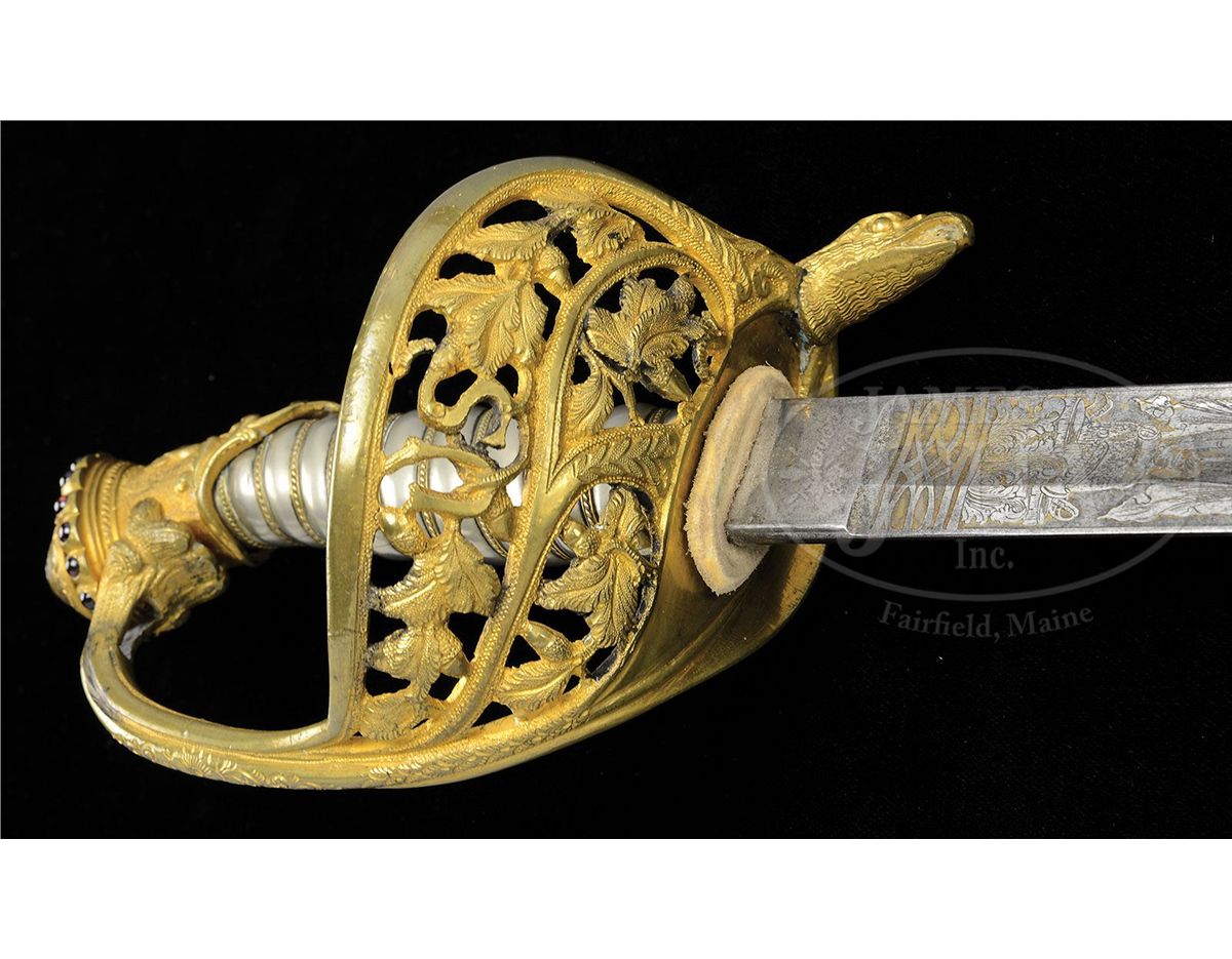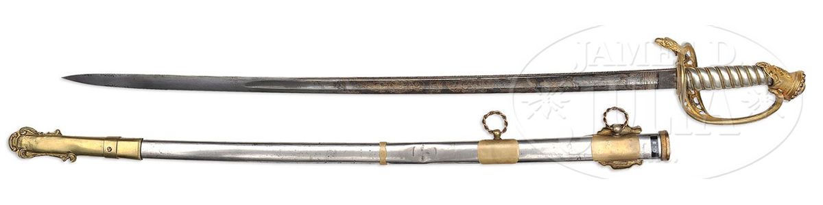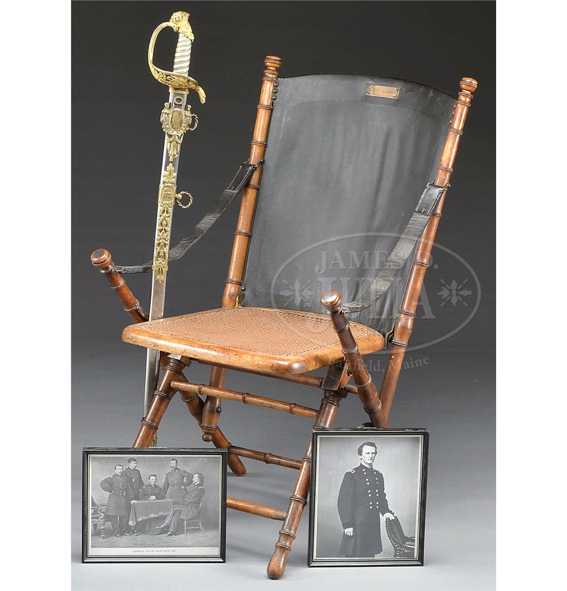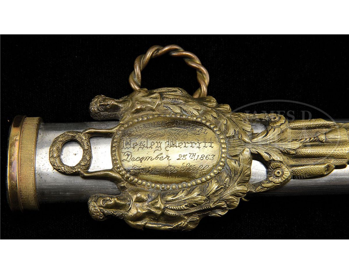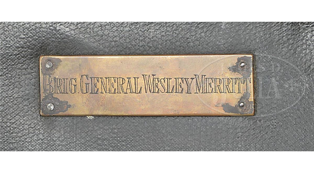 This lot includes a high grade U.S. Staff and Field Officer's sword with silver grip, high relief mounts, jeweled pommel and gold highlighted blade. Also included is the only camp chair we have ever seen with a General's name on brass plaque on back; an 1885 inscribed artillery manual from when Merritt was commandant at West Point; also a biography of Merritt by Don Alberts Brandy Station to Manila Bay(number 18 of 25 special bound edition). This is a beautiful sword which presentation reads "BRIGADIER GENERAL WESLEY MERRITT, DECEMBER 25TH 1863 FROM HIS STAFF". Wesley Merritt had a long and illustrious military career spanning his graduation from West Point, Civil War service, Indian War service, and the Spanish American War. CONDITION: Sword is in very good to fine condition with 32" blade by Clauberg, and is agent marked "Hunt & Goodwin". Blade has etched panels of various military and patriot motifs including large panel that reads "PERSEVERE". Steel scabbard body is sound and solid with numerous small dings, dents and scratches and old cleaning. Top mount with presentation and middle mount both have elaborate relief cut-out designs and unusual twisted copper wire sword rings, as can be seen in photos. The drag, which also has relief decoration, has a similar fine stippled design along edge, as does throat. Spiral cut silver grip is very good with scattered small dings and dents, still complete with its triple wire wrap. Top stone in pommel cap is badly cracked but still intact. 16 small cabochons that circle crown of pommel are complete and intact. Hilt and pommel retain strong traces of gilt in protected areas, as can be seen in photos. Folding chair is sound and solid and functional with leather back and caning to seat. Signed book has water staining around top of spine and covers with some foxing, though book appears complete and intact and signature page is easily read. Special edition biography is like new in slip case. There is a circa 1900 cabinet card of Merritt in uniform also, which is in good condition with chipping at edges of card. There are also 5 framed large reproductions of photos of Merritt at various time in his career, all in good condition, that accompany lot. 4-47320 JS33