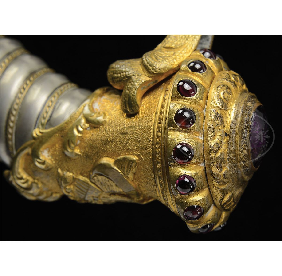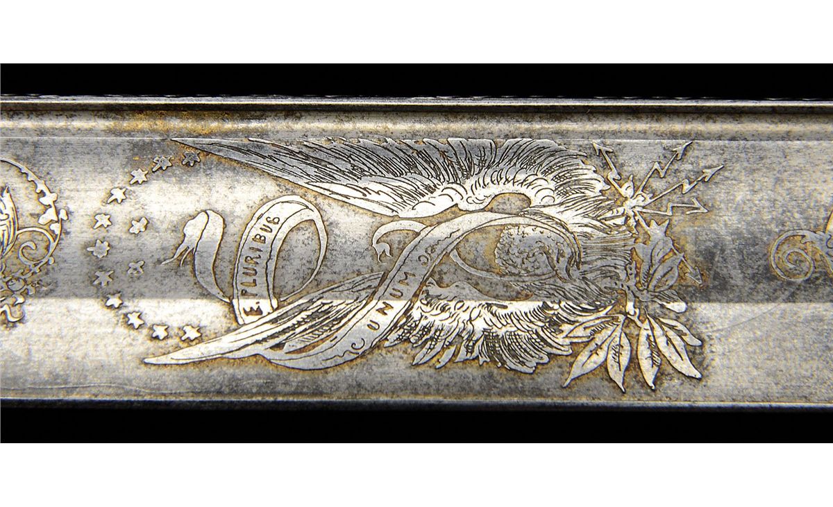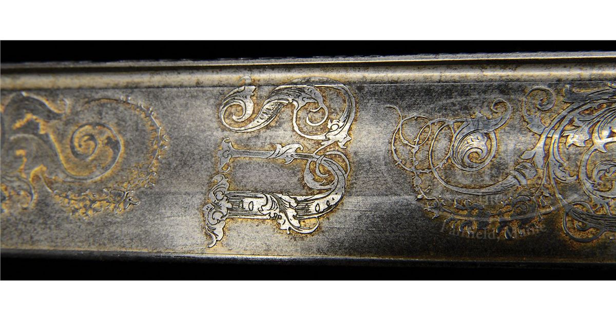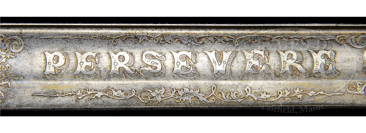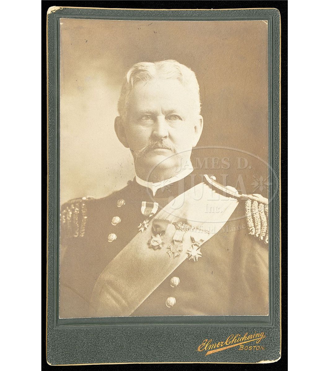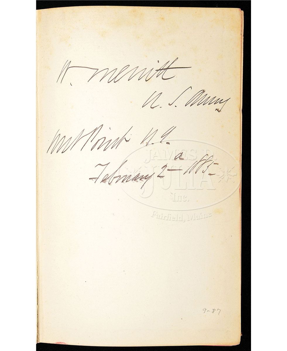 This lot includes a high grade U.S. Staff and Field Officer's sword with silver grip, high relief mounts, jeweled pommel and gold highlighted blade. Also included is the only camp chair we have ever seen with a General's name on brass plaque on back; an 1885 inscribed artillery manual from when Merritt was commandant at West Point; also a biography of Merritt by Don Alberts Brandy Station to Manila Bay(number 18 of 25 special bound edition). This is a beautiful sword which presentation reads "BRIGADIER GENERAL WESLEY MERRITT, DECEMBER 25TH 1863 FROM HIS STAFF". Wesley Merritt had a long and illustrious military career spanning his graduation from West Point, Civil War service, Indian War service, and the Spanish American War. CONDITION: Sword is in very good to fine condition with 32" blade by Clauberg, and is agent marked "Hunt & Goodwin". Blade has etched panels of various military and patriot motifs including large panel that reads "PERSEVERE". Steel scabbard body is sound and solid with numerous small dings, dents and scratches and old cleaning. Top mount with presentation and middle mount both have elaborate relief cut-out designs and unusual twisted copper wire sword rings, as can be seen in photos. The drag, which also has relief decoration, has a similar fine stippled design along edge, as does throat. Spiral cut silver grip is very good with scattered small dings and dents, still complete with its triple wire wrap. Top stone in pommel cap is badly cracked but still intact. 16 small cabochons that circle crown of pommel are complete and intact. Hilt and pommel retain strong traces of gilt in protected areas, as can be seen in photos. Folding chair is sound and solid and functional with leather back and caning to seat. Signed book has water staining around top of spine and covers with some foxing, though book appears complete and intact and signature page is easily read. Special edition biography is like new in slip case. There is a circa 1900 cabinet card of Merritt in uniform also, which is in good condition with chipping at edges of card. There are also 5 framed large reproductions of photos of Merritt at various time in his career, all in good condition, that accompany lot. 4-47320 JS33