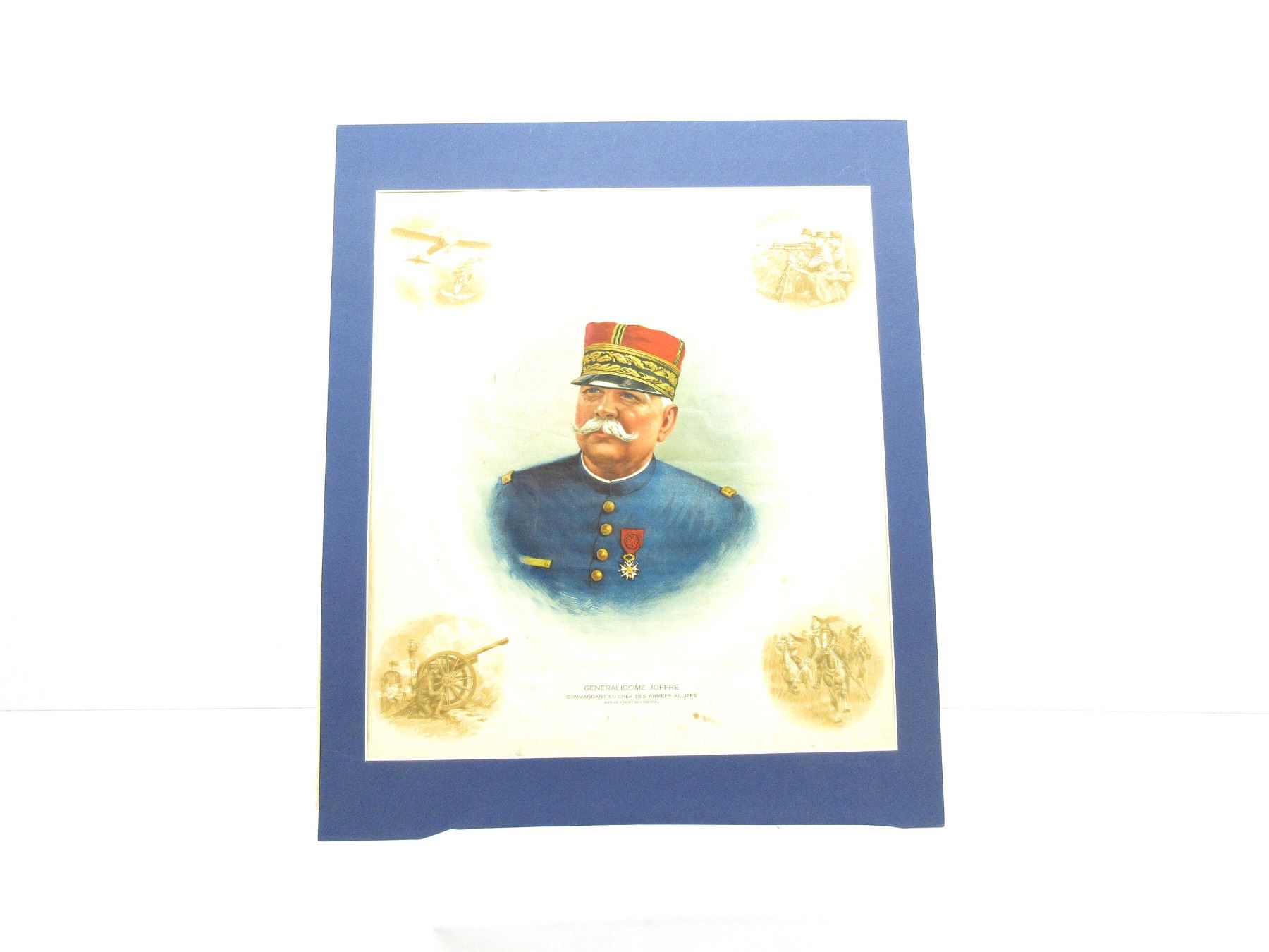 (1) IMAGE OF FRENCH GENERAL JOSEPH JOFFRE WHO SERVED AS COMMANDER IN CHIEF DURING WWI, PRINTED AND/OR PAINTED ON SILK WITH BRISTOL BOARD FRAME & BACKING, MARKED: "GENERALISSIME JOFFRE, COMMANDANT EN CHEF DES ARMEES ALLIEES, SUR LE FRONT OCCIDENTAL", NO LONGER AFFIXED TO BACKING, FRAME PARTIALLY ATTACHED AT THE TOP, APPROX. 24 1/8" X 20 1/8". SEE PHOTOS.