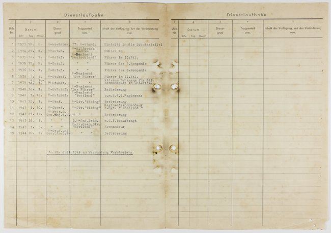 Important war-date typed document recommending Waffen-SS Gen. FRITZ VON SCHOLZ be awarded the Oak Leaves to the Knights Cross for his brilliant defense of the Narva isthmus near Leningrad in 1944. The document, signed in type by FELIX STEINER, is 6pp. large 4to., [n.p.., n.d., but typed in Berlin, February, 1944], and is titled: I>"Recommendation for the Bestowal of the Oak Leaves to the Knight's Cross of the Iron Cross." The document, typed in an extra-large font to allow easy reading by Adolf Hitler, first sets forth von Scholz's name, rank, rank, status, and previous awards. There follows Steiner's accounting of von Scholz's actions deserving of the Oak Leaves. In part: "...During the engagements in the Northern part of the Eastern Front, from 16 January until now, SS-Brigadefuhrer Fritz von Scholz continually proved himself... His division had the task of pushing itself forward along the track Kipen-Narwa against the superior enemy forces... On 28 January 1944 the enemy succeeded to break through... now the dangerous threat to the Battle Group 'Lohmann'... were surrounded by the enemy... Scholz conducted a counterattack... and reopened the runway, throwing the enemy back... In spite of strong attacks by the enemy tanks, parts of the division succeeded in breaking up their continuous attacks... created the basis for the orderly occupation of the Narwa bridgehead... made it possible to win time for the introduction of the Panzer Grenadier Division 'Feldherrnhalle'... his rigidness drove the troops... this exemplary steadfastness... carried this still young division along..." There follows a March 6, 1944 endorsement from the field signed in type by HEINRICH HIMMLER wherein he supports Steiner's recommendation that the award be made. This document was then sent to Fuhrer Headquarters in Berlin where Hitler's adjutant RUDOLF SCHMUNDT submitted the recommendation to Hitler who approved the award. Schmundt in turn accordingly endorses the document: "Recommended" and adds his signature on March 11, 1944. Also present is von Scholz's service record, 4pp. 4to., his photo attached to the first page with a listing of all of his postings within. The last entry notes von Scholz's death on July 28, 1944. The former document has marginal file holes but is otherwise fine, the latter is stained a bit at left and also has file holes. With translation. Finally included is an original 5" x 7" photo showing von Scholz in uniform. FRITZ VON SCHOLZ (1896-1944) first commanded a battalion in the SS-Regiment Der Fhrer which would later become the 2nd SS Panzer Division, "Das Reich" Division. After seeing action in the west, von Scholz was transferred east to lead the Nordland Division where he took Rostov and was awarded his Knights Cross. After fighting partisans in Croatia, von Scholz was then sent to Leningrad still commanding the 11th SS Panzergrenadiers but now under Felix Steiner. On March 12, he would be officially awarded his Oak Leaves. In late July, after the collapse of Army Group Centre, Steiner's corps retreated to behind the Narva River. On July 27, while visiting the front line, Scholz was caught in an artillery barrage and received a mortal head wound. He was posthumously awarded the Swords to the Knight's Cross on Aug. 8, 1944.