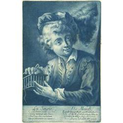 “Die Mauß”. Junge hält einen Käfig mit einer gefangenen Maus in der Hand. Schabkunstblatt in Blau bei Johann Jacob Haid, um 1750. - Mit deutschem und franz. Text, der Verlegeradresse und Verlagsort “A. V.” (Augsburg) in der Platte. Folio. Stellenweise etwas gebräunt und stockfleckig sowie mit geglätteten Knickspuren. Seltenes und eindrucksvolles Beispiel für die Schabkunsttechnik.