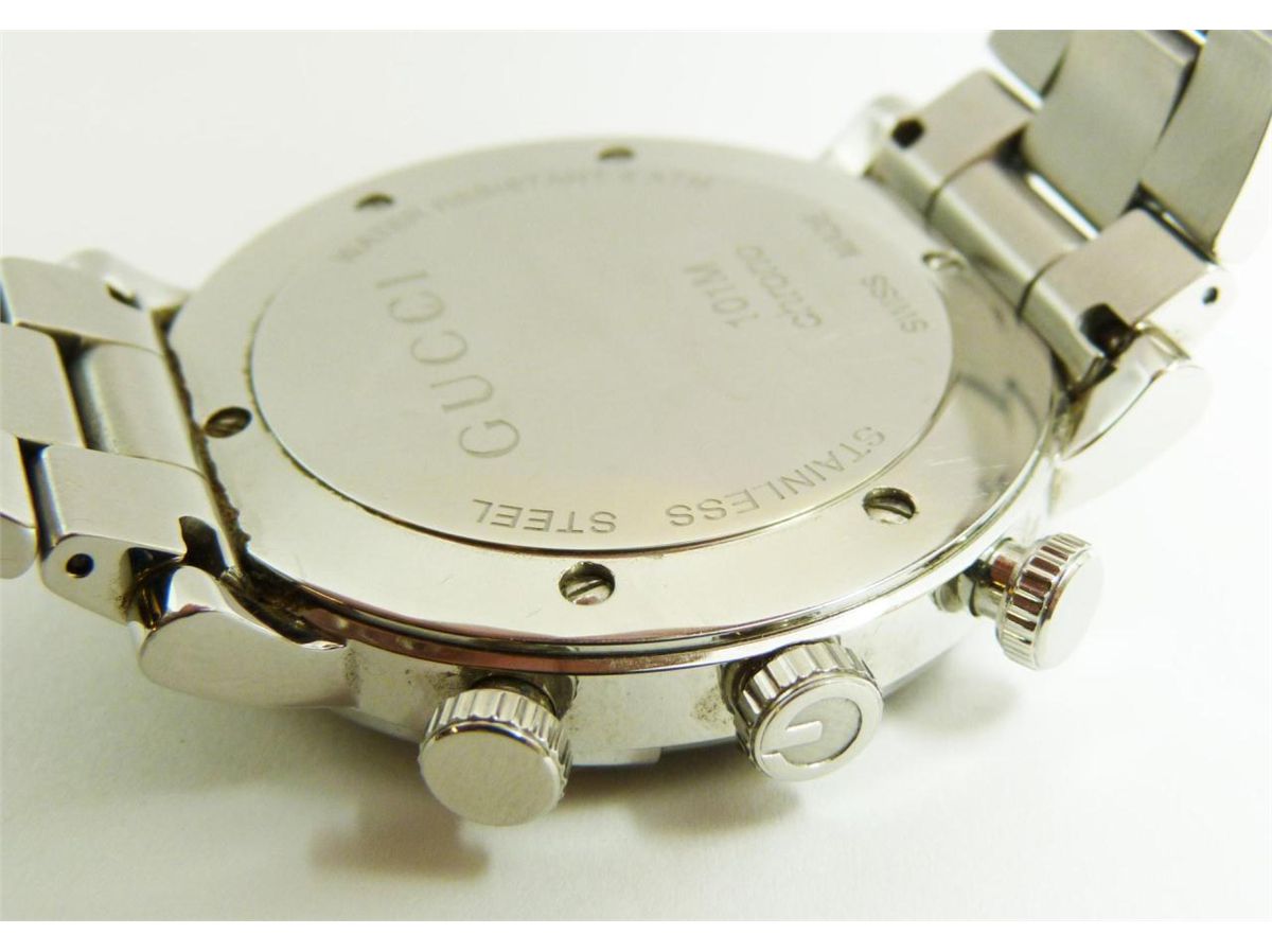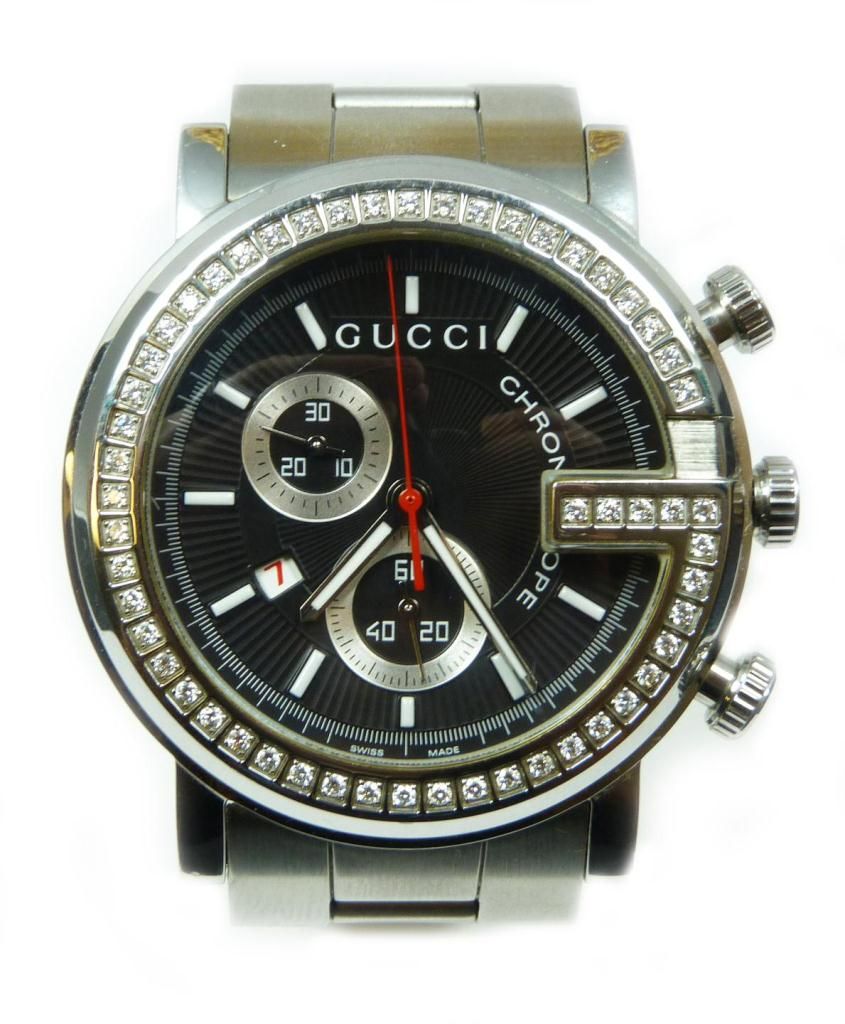 A stunning men's Gucci stainless steel chronoscope "G" wristwatch. Has black textured face with silvered hour and minute hands with red second hand. Sub second hand and sub date. Raised white enamel notches. Diamond G shaped bezel holding 54 round cut white diamonds approx. 1.08ctw. Stainless steel case and original Gucci brick link band. Verso marked 'GUCCI 101M chrono11834550 SWISS MADE STAINLESS STEEL WATER RESISTANT 3 ATM'. Case measures approx. 1 3/4" diameter (4.4cm). Band approx. 8" length (20.3cm). Watch weight of 152 grams. Includes original brown presentation box and manual with sleeve.
