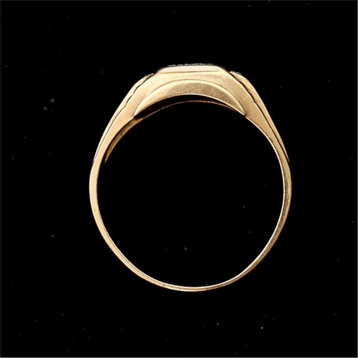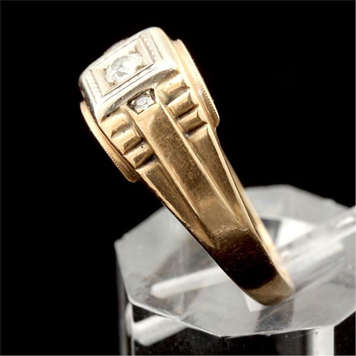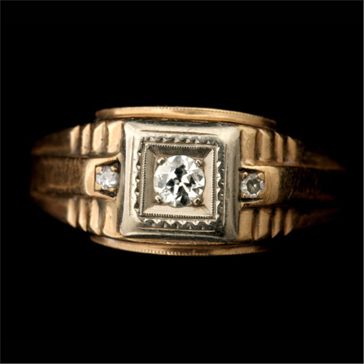 GENTLEMAN'S DIAMOND, 14K YELLOW & WHITE GOLD RING. Centering one full-cut diamond weighing a total of approximately 0.20 ct., beads set in 14k white gold, accented by two single-cut diamonds weighing a total of approximately 0.04 ct., bead set in 14k yellow gold. Size 12 3/4, 3.80 dwts