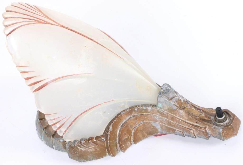 Genuine ~1920's Art Deco Sconce. To feature a frosted glass shade with elegant geometric lines and subtle dark accent striping. The glass shade is designed in a fan-like shape, characteristic of the bold and symmetrical style of the Art Deco era. The ornate metal base showcases intricate detailing with an aged patina, adding timeless charm to the piece.