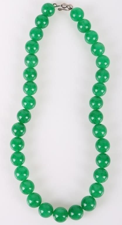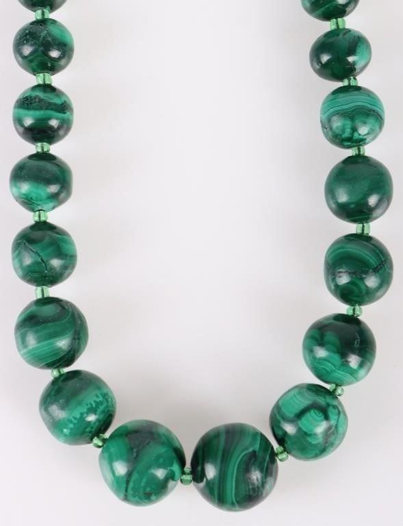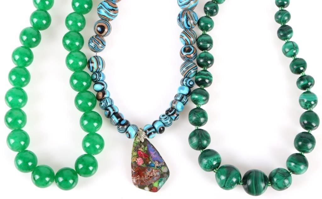 Genuine beaded necklaces lot of 3 to include: Genuine Jade necklace with 33 12" beads, vintage genuine malachite necklace, blue malachite jasper necklace with pendant.