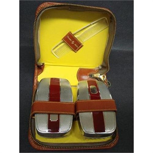 THIS IS TRUE GENTS ART DECO SET, CONSISTS FROM HAIR BRUSH, CLOTHES BRUSH AND A SMALL CELLULOID COMB, as per images,THE SET COMES IN GENUINE LEATHER CASE, THE BRUSHES ARE OF HIGH QUALITY,MADE FROM HIGHLY DECORATED CHROME AND BAKELITE OR ENAMEL STRIP,(hard to say), the set comes in excellent condition, seems never used, but for the vinyl lining on inside the box being vinyl it started to show age.Each brush measures about 4 1/2" x 2 1/2", US Buyer to pay 8.00 for shipping plus insurance.THANKS.