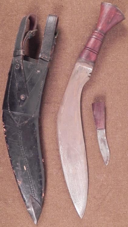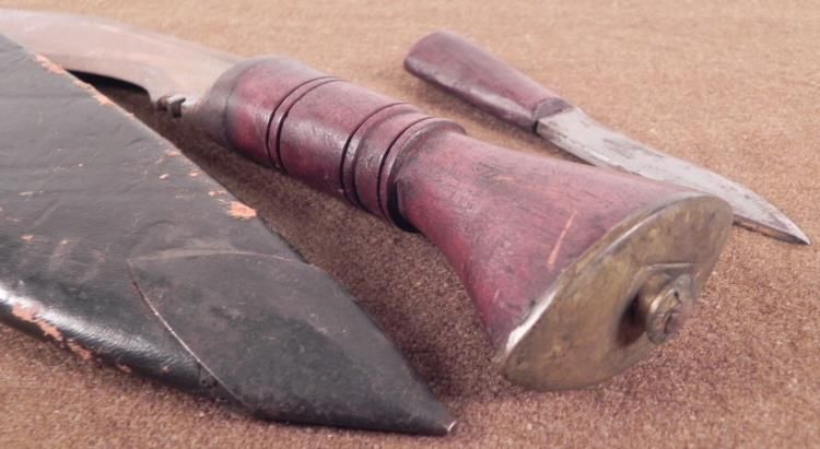 GENUINE MILITARY KUKRI WITH STRAPPED SCABBARD & UTILITY KNIFE * THIS IS A GENUINE EARLY 20TH CENTURY NEPALESE MILITARY KUKRI-BEAUTIFUL ROSEWOOD GRIP -WINGED "V" ON THE POMMEL CAP-CURVED BLADE USED TO ATTACK OPPONENT IN THE GUTS--BLOOD GROOVES ON EACH SIDE--LEATHER & WOOD SCABBARD-METAL TIP--TWO TOP BUCKLED STRAPS--INE BACK POUCH AND ONE UTILITY KNIFE--GREAT ORIGINAL PIECE THAT HAS NOT BEEN CLEANED UP OR IN COLLECTOR'S HANDS *
