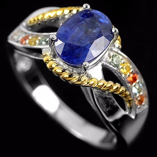 Natural MULTI COLOR SAPPHIRE & CZ 925 SILVER RING 14K WHITE-YELLOW GOLD COATING......ring size ..6.5; Main Stone.....Blue Sapphire 1.55 cts....8 x 6 mm.....heated;FACE OF RING 19 X 10 MM. SAPPHIRE & CUBIC ZIRCONIA ........TOTAL 4 Grams