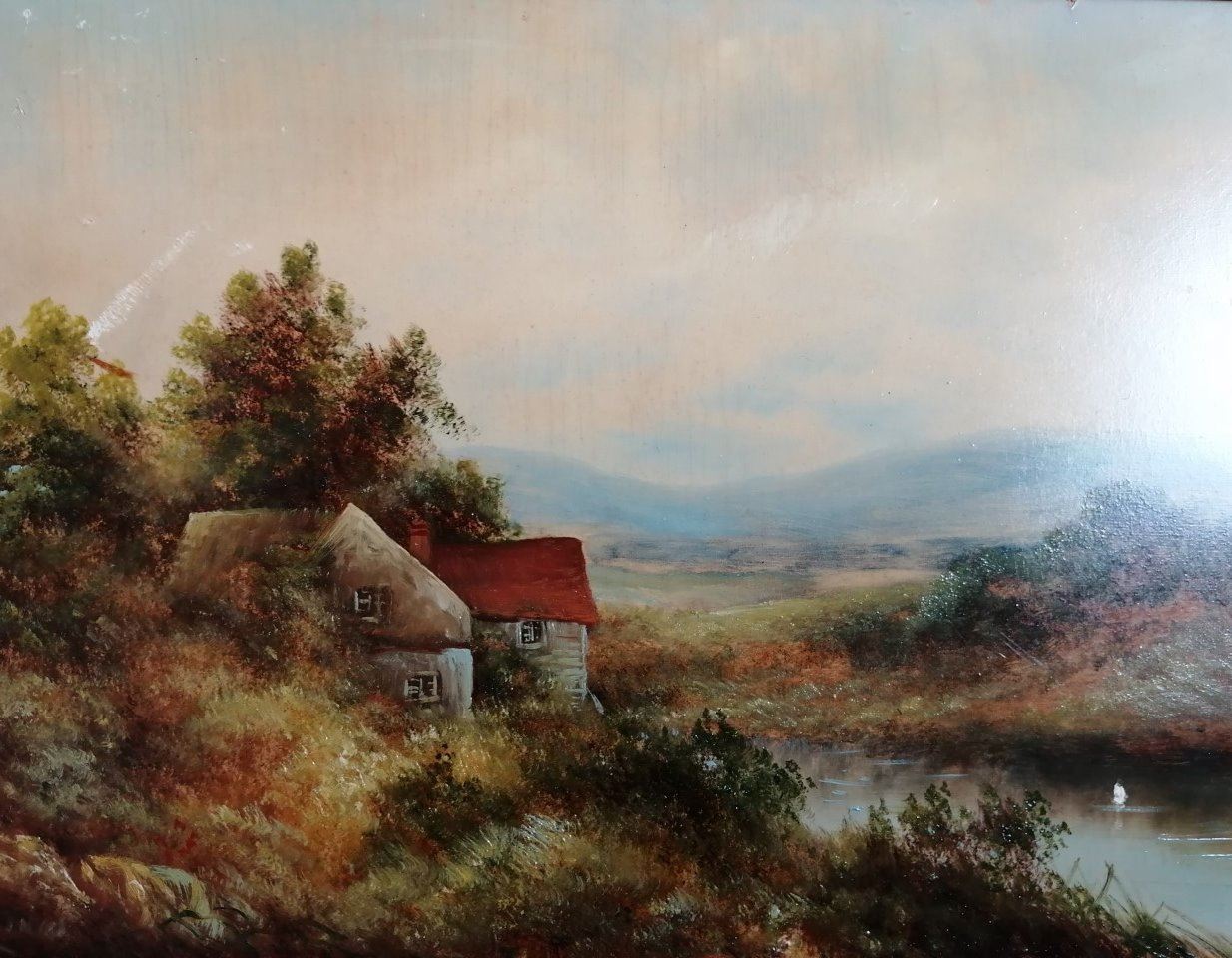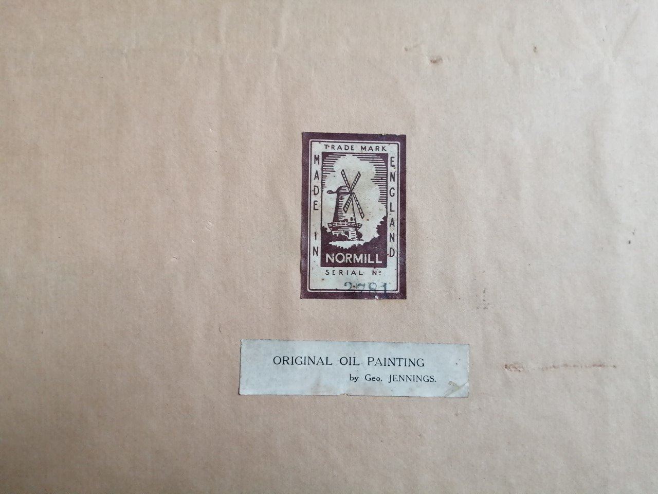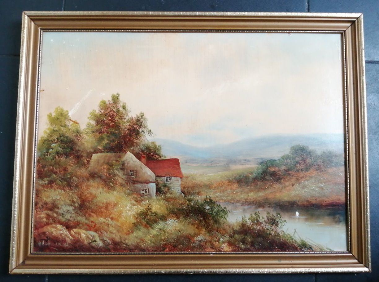 ENGLISH COUNTRY LANDSCAPE OIL PAINTING. A delightful tranquil oil painting depicting a beautiful house in a country landscape scene with rolling hills in the background. Painted and signed by Geo Jennings. Original frame. Size of painting: 20 x 14.5 inches.