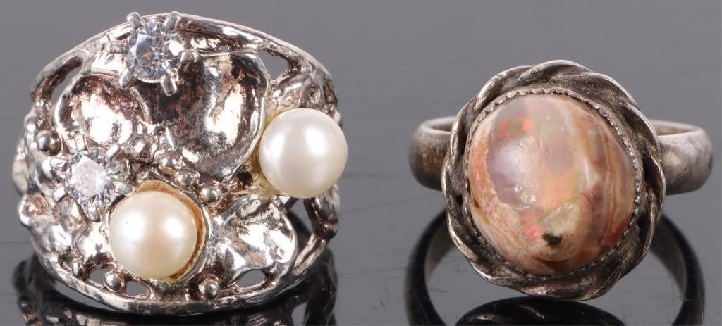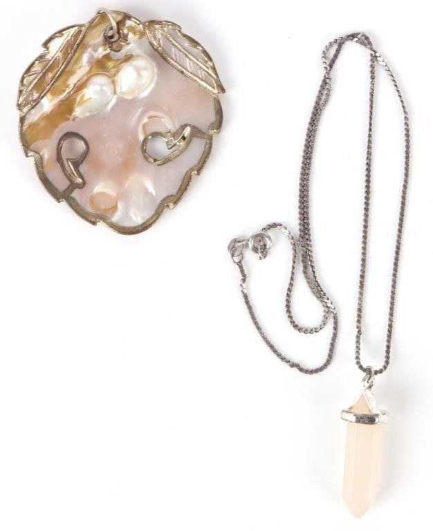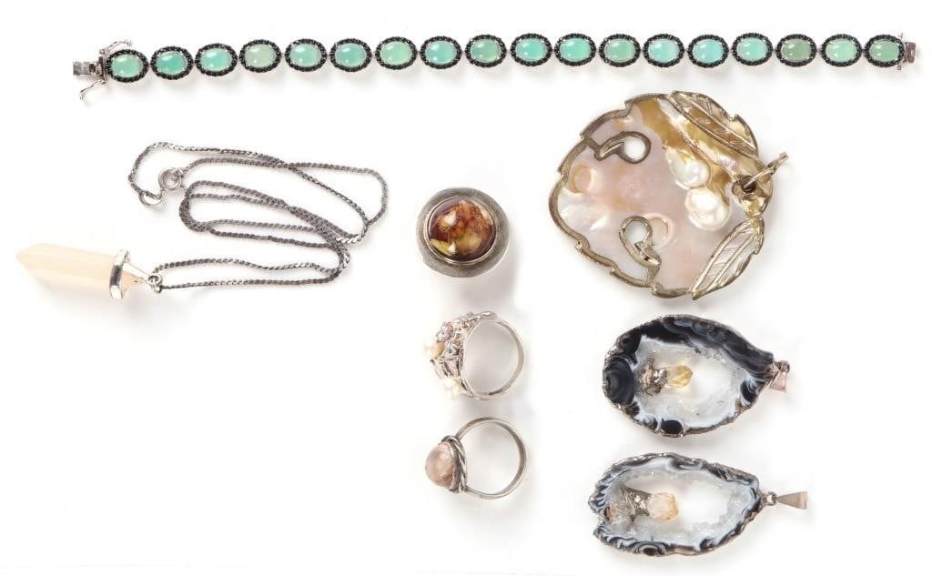 Geode, gemstone and shell sterling silver ladies jewelry to include two geode pendants, one leaf shell pendant, one pearl ring. one opal ring, one blue opal bracelet, and one necklace.