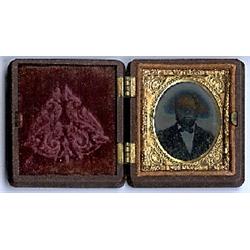 Tintype with great spreading oxidization giving the man a grotesque appearance.