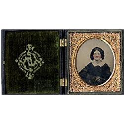 Ambrotype of lady. When you open the case, there’s slight roughness at the outside edge beside the clasp, to the left of the green velvet. Nothing else noted