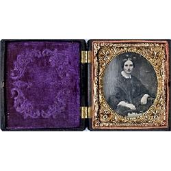 Daguerreotype of woman (cleaned and wiped.) Case has 3 chips along edges and one corner roughened.