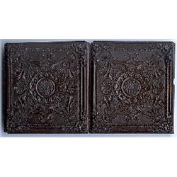 Daguerreotype of a woman with folded arms, shiny buttons and pin. Case has just two bruised corner tips, one dig in an edge.