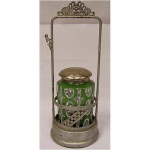 <table width="100%" border="0" cellspacing="0" cellpadding="4"><tr><td><em> </em></td></tr><tr> <td width="100%"> This is a very nice light green and clear geometrical shaped pickle caster. The edge of the lid which is I believe silver plate has a small hairline crack of about 1/8' on it's edge. The lid sports a cool floral pattern. The circles are flattened and the linial pattern is cut into the glass. It is held in a metal base with it's own floral pattern, unfortunately there is no fork. The base has at some point been painted silver. A real nice early piece for your colletion. </td></tr><tr> <td> </td></tr><tr> <td>Reference #: JW46_144</td></tr><tr><td>Condition:EXCELLANT</td></tr><tr><td>Year:1850'S-1880'S</td></tr><tr><td>Country:USA</td></tr><tr><td>Maker:UNKNOWN</td></tr><tr><td>Height:4.5</td></tr><tr><td>Depth:3</td></tr><tr><td>Width:3</td></tr><tr><td>Weight:1.5</td></tr><tr><td>Title:GEOMETRICAL GREEN PICKLE CASTER</td></tr><tr><td>Style:GEOMETRICAL GREEN PICKLE CASTER</td></tr><tr><td>Materials:GLASS</td></tr><tr><td>Type:GEOMETRICAL GREEN PICKLE CASTER</td></tr><tr><td>Location:Portland, Indiana</td></tr></table>