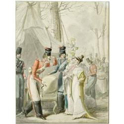 Offiziere empfangen zuvorkommend zwei vornehme Damen in ihrem Lager. Aquarellierte Tuschfederzeichnung, vermutlich als Originalvorlage zur Buchillustration “Die Welt en miniature oder Tableau der Charakteristika der verschiedenen Nationen”, Leipzig 1831. - Auf Vélin. Größe: 35,5 x 27 cm. Gering gebräunt und unter Passepartoutblende montiert.