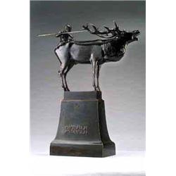GEORG GRASEGGER (1873-1927) Figur Oktober Morgen, Bronze, patiniert. Auf hohem, vierkantigem Sockel röhrender Hirsch, auf dessen Rücken ein Putto mit wurfbereitem Speer reitet. Speerhand mit Lötspuren zur Befestigung des Speers H.: 47 cm. Bez.: Vorder- und rückseitig am Sockel Titel OKTOBER MORGEN. Lit.: Dekorative Kunst VII, Heft 12, September 1904, S. 481. - Vergleichbare Skulptur mit Gießereimarke Lauchhammer Bildguß und Signatur Grasegger sowie die Bezeichnung OKTOBER MORGEN siehe Ketterer Auktionskatakog 81 Lot 295.