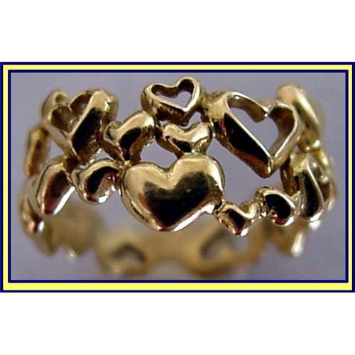 18 carat gold ring made by Danish designer Georg Jensen, probably early 20th century.<BR>The ring is quite small - size 5.5<BR>The entire ring consists of hearts - solid, openwork, some larger, some smaller. In places the band is wider and in others it dips and curves, adding to the interest. <BR>The inside of the ring has a number of hallmarks: the word DENMARK, 750 (for 18k gold), a series of tiny gold hallmarks, a rectangle with the initials JG and possibly something next to it as well as an impressed oval. <BR>Condition is very good.