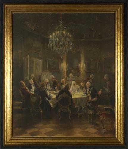LITHOGRAPH 28'' X 23 1/4'', Georg Schobel (1860-1941), German. ''The Supper''; An 18th century French court scene at the Castle of Sans Soucy. At the head of the table are Frederick the Great and Voltaire. Early 20th century. Paper label on the verso. Placed in a gilt frame.