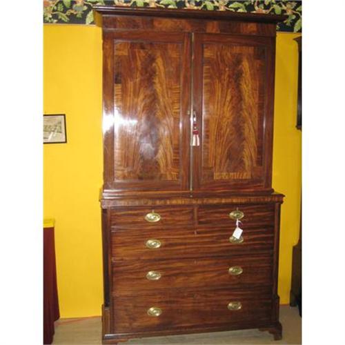 A SUPERB QUALITY GEORGE 111 FLAME MAHOGANY VENEERED LINENPRESS. THE INSIDE OF THE LINENPRESS HAS 3 SHELVES WHICH ARE FULLY ADJUSTABLE. THE CHEST HAS TWO SMALL DRAWERS OVER 3 LONG DRAWERS WITH THE ORIGINAL BLUE PAPER LINING TO THE DRAWERS. THE FRONT OF THE CUPBOARD DOOR IS BRASS EDGED ALL THE WAY DOWN TO THE CHEST.THIS PIECE COMES IN TWO PARTS FOR EASE OF MOVEMENT. EVEN THE TOP CORNICE EDGES ARE ALL VENEERED BEAUTIFULLY WITH FLAME MAHOGANY. EACH END OF THE CHEST IS DECORATED WITH FINELY REEDED COLUMNS AND IS SET ON BRACKET FEET.ALL THE PROPORTIONS ON THIS PIECE ARE EXTREMELY GOOD. IT WAS MADE CA 1780 IN ENGLAND. THE FINISH IS ORIGINAL TO THE PIECE WITH A FABULOUS PATINA.