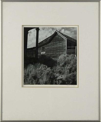 GEORGE A. TICE (American, 1938-) WEATHERED FARMHOUSE. Photograph of a side view of a farmhouse with porch of another house on left side. Mounted on board and pencil signed beneath “Geo. A. Tice”. Housed in a modern aluminum frame with white matte. PROVENANCE: From a Waterville, Maine collection. PHOTO SIZE: 8” x 7-1/2”. CONDITION: Very good. 9-26906