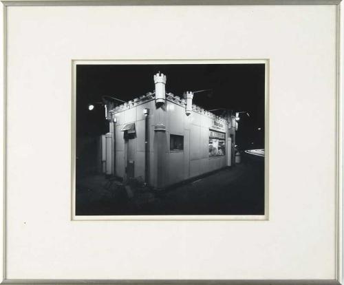 GEORGE A. TICE (American, 1938-) WHITE CASTLE.  This is the White Castle on Rte 1 in Rahway, New Jersey.  Photograph shows a lit up white castle hamburger restaurant at night.  Mounted on board and pencil signed beneath “Geo. A. Tice”.  Housed in a modern metal frame with white matte.  PROVENANCE:  From a Waterville, Maine collection.  PHOTO SIZE:  7-1/2” x 9-1/2”.  CONDITION:  Very good.  9-26908