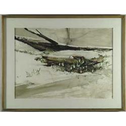 Lot 44 GEORGE A. WEYMOUTH (American, 1936-) “SNOWDROPS”GEORGE A. WEYMOUTH (American, 1936-) “SNOWDROPS”. Large watercolor scene shows fallen tree next to snow covered rock with snowdrop flowers beside. Signed lower left “G. Weymouth”. Housed in a simple painted wood frame with a thick white matte. Weymouth is a Brandywine River Valley artist working in the tradition of Andrew Wyeth and is the founder of the Brandywine Conservancy. “Coe Kerr Gallery, New York” label affixed to back. SIZE: 21-1/2” x 29-1/2”. CONDITION: Very good. 12-329 (2,000-4,000)
