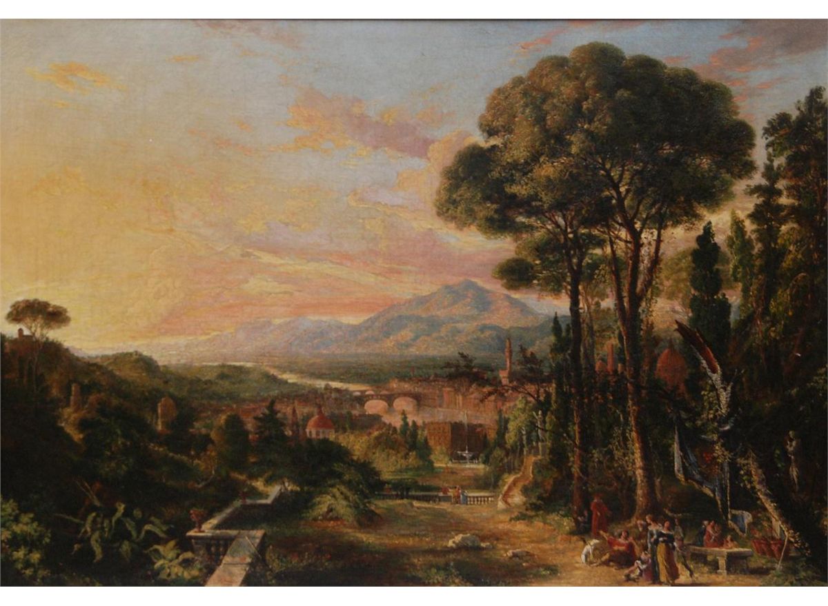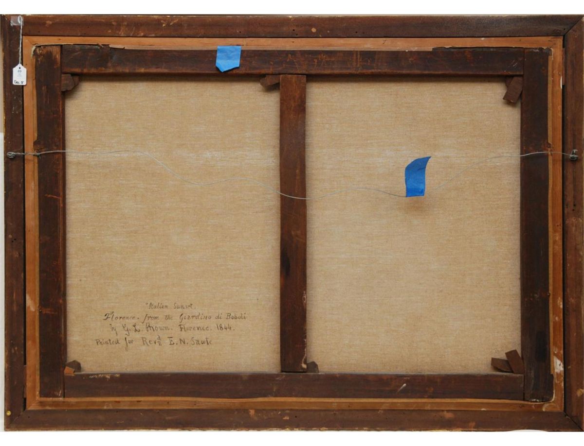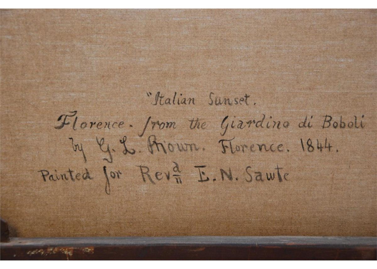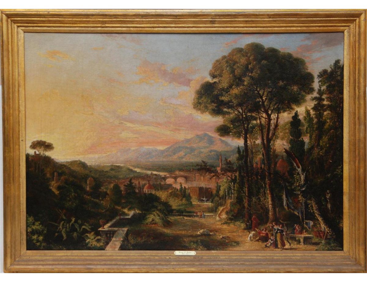George Loring Brown (AMERICAN, 1814-1889) oil painting on canvas depicting a Florence, Italy scene. Signed to lower center and marked "Florence" with a date of 1844. Mounted in gilded wooden frame with name plaque to center. Measures 30" height x 44" width + 3" frame (76.2cm x 111.7cm + 7.6cm). Provenance: Has Christie's appraisal. Sam Feldman collection.