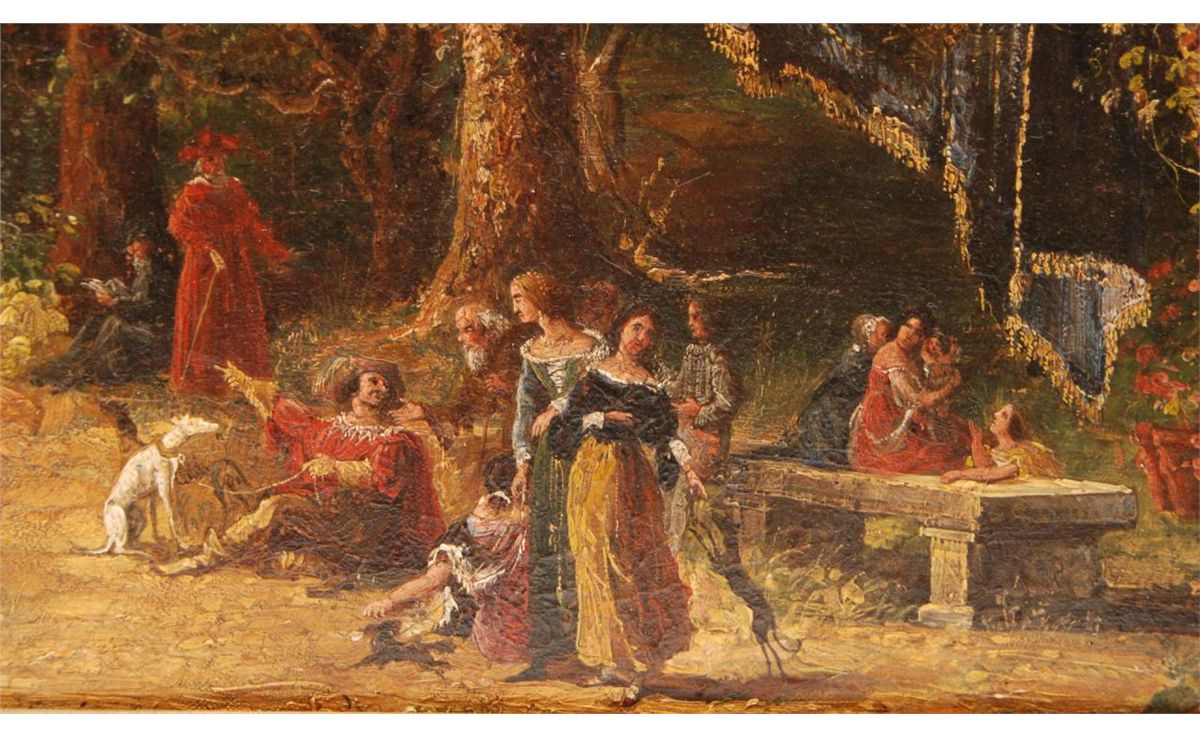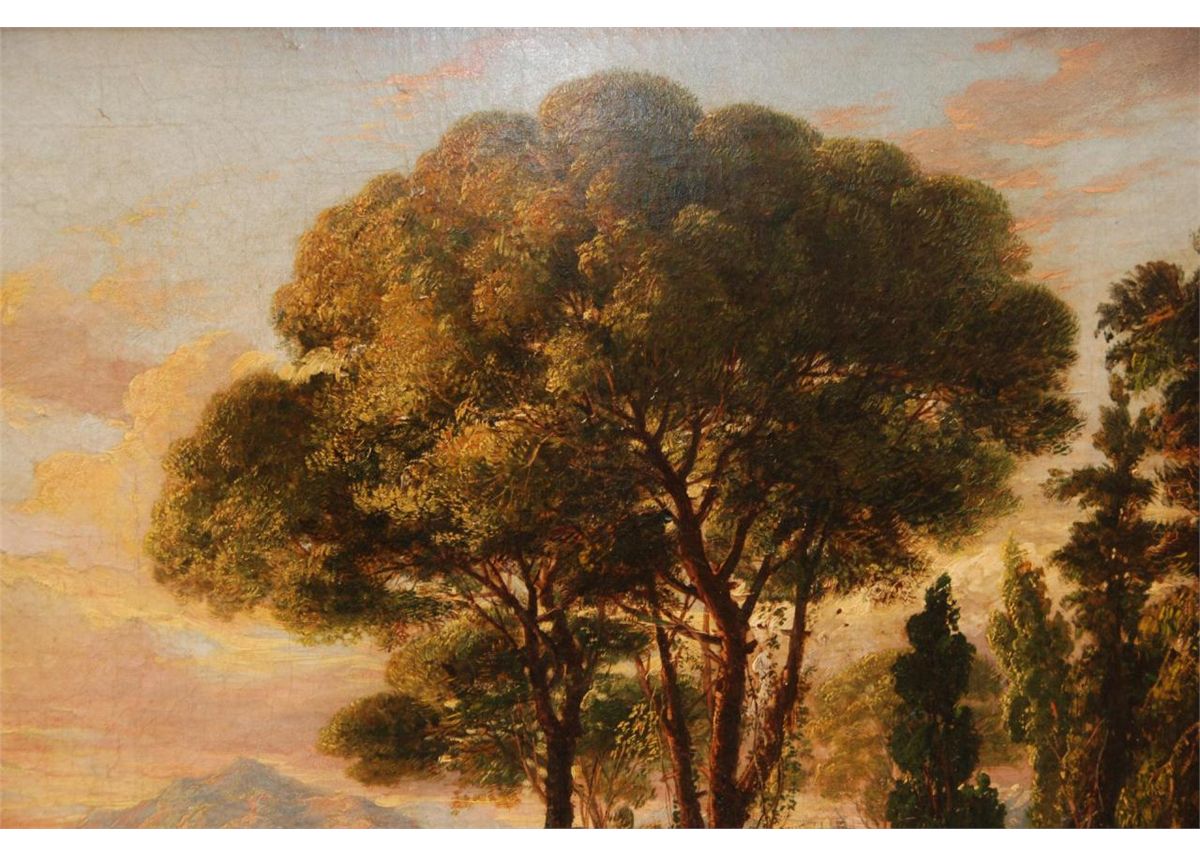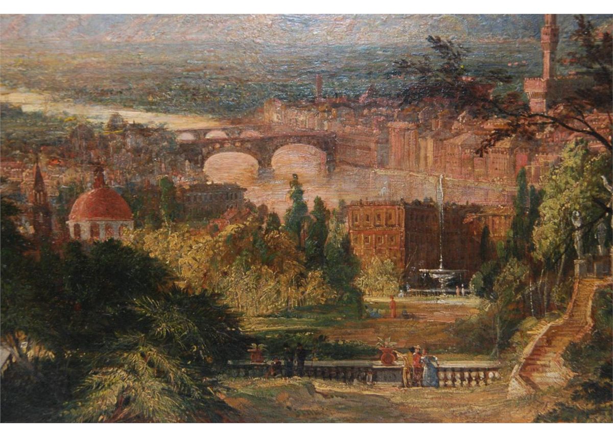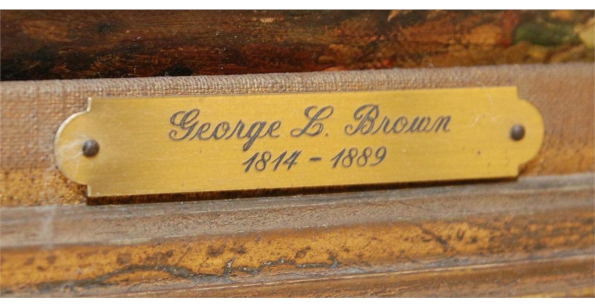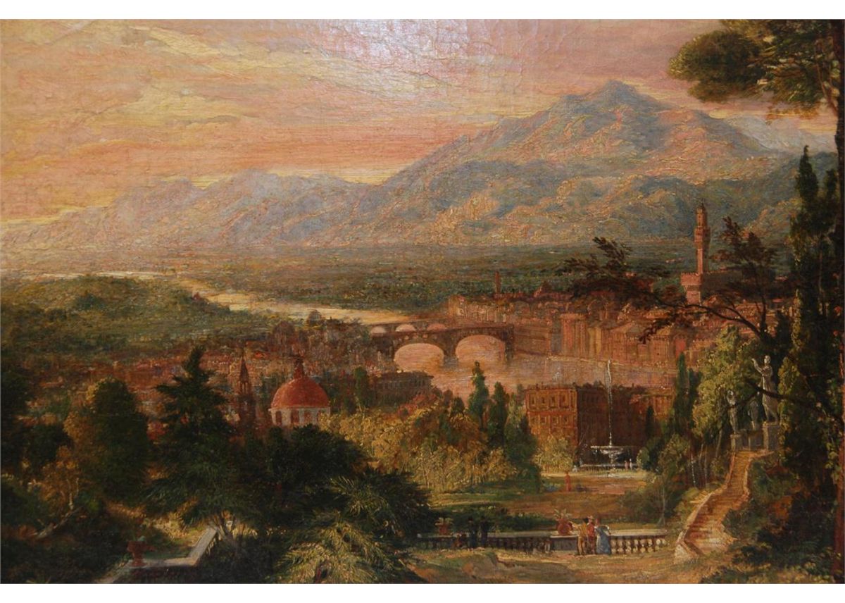 George Loring Brown (AMERICAN, 1814-1889) oil painting on canvas depicting a Florence, Italy scene. Signed to lower center and marked "Florence" with a date of 1844. Mounted in gilded wooden frame with name plaque to center. Measures 30" height x 44" width + 3" frame (76.2cm x 111.7cm + 7.6cm). Provenance: Has Christie's appraisal. Sam Feldman collection.