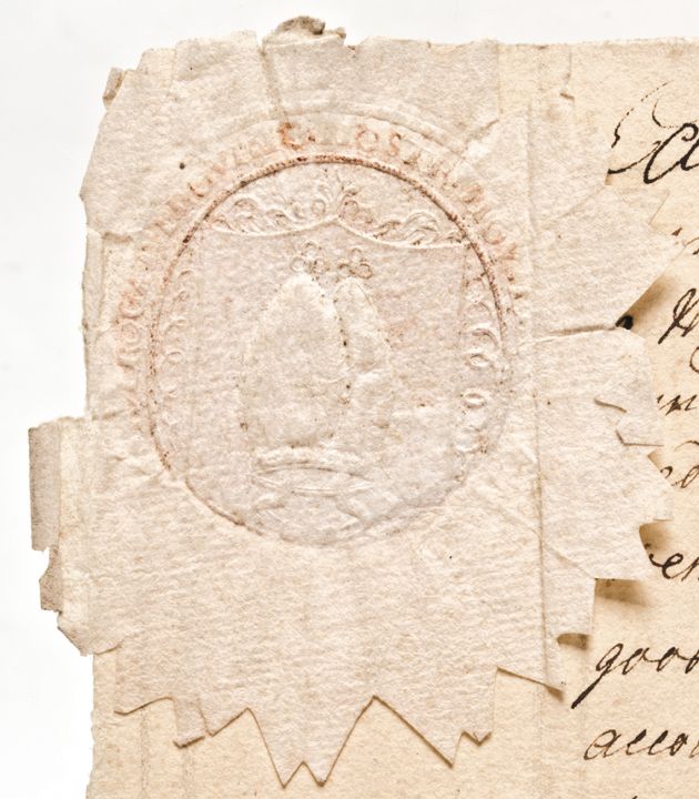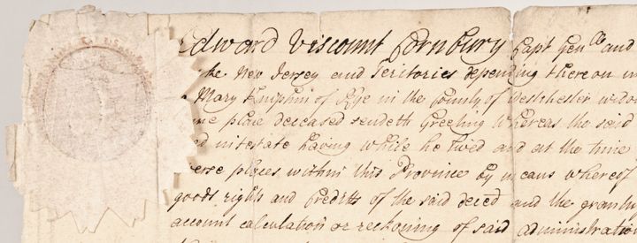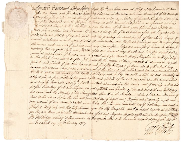 February 20, 1797-Dated, Manuscript Document Signed, “Geo. Clarke,” as probate clerk of New York for “Edmund Viscount Cornbury,” being an issued Land Grant, Fine. This original document dated 1707, measures 10” x 13” where George Clarke has signed a grant of probate as the Clerk to Lord Cornbury, to Mary Kniffen, the wife of the late Samuel Kniffen. She has inherited his entire estate, but must also be responsible for paying any debts owed. Samuel Kniffen, was the Constable and Tax Collector of Rye, New York in 1701. It is Signed by George Clarke at lower right. The Document itself having a fully intact embossed wax and paper Official Seal at the upper right. There are some archival strips of tape for reinforcement on the blank reverse side where some fold lines were splitting. Overall, a very collectable document even condition.