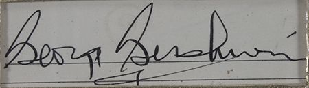 (1898 - 1937) American composer and songwriter in collaboration with his brother Ira, his works include "Porgy and Bess", "Rhapsody in Blue", and "An American in Paris". Fine bold signature matted with a classic portrait of Gershwin at the piano and set into a gilt frame. A bit closely-cut, otherwise in very good condition. Not examined out of frame.