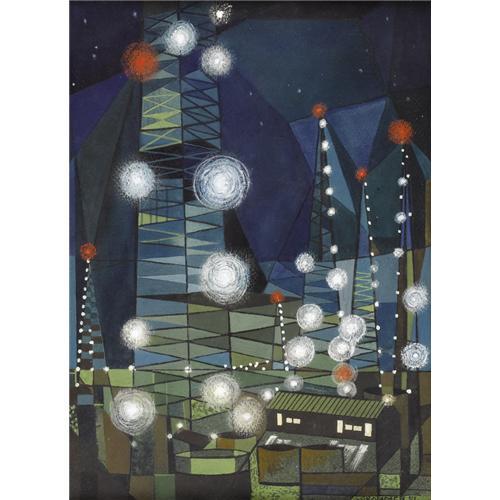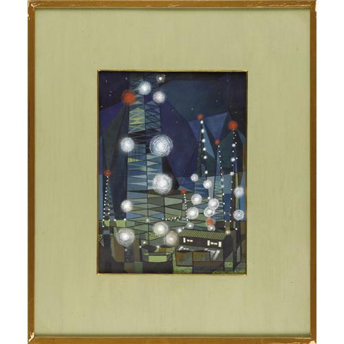 <B>GEORGE GRAMMER (b. 1928)</B></I><BR><I>Oil Derricks,</B></I> 1951<BR>Watercolor and gouache<BR>16in. x 12in.<BR>Signed lower right<BR><BR>George Grammer made his sparkling nocturnal scenes of oil derricks icons of modern Texas art. This work is accompanied by a hand-painted mat designed by the artist.<BR><BR>Provenance:<BR>Acquired from the artist<BR>Fort Worth Estate<BR><BR> <B>Condition Report:</B> Excellent condition. Period frame and hand-painted mat in excellent condition.<BR><BR><b>Shipping:</b> Requires 3rd Party Shipping (<a target="_blank" href="http://www.heritageauctions.com/common/shipping.php">view shipping information</a>)