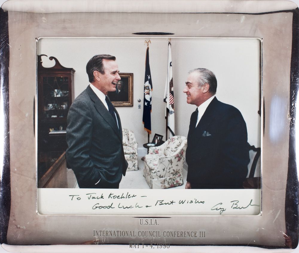 (b. 1924) Forty-first President of the United States who ordered the attack on Iraq to liberate Kuwait. I.S.P. as President, 10" x 8" color, shows him greeting ex-CIA operative and Reagan Director of Communications John Koehler. Inscribed: "To Jack Koehler - Good Luck & Best Wishes George Bush". Fine, in silver-plated frame engraved: "U.S.I.A. International Council Conference III May 1-4, 1990". The United States Information Agency (USIA) also known as Propaganda Agency of the United States, which existed from 1953 to 1999, was a United States agency devoted to "public diplomacy".