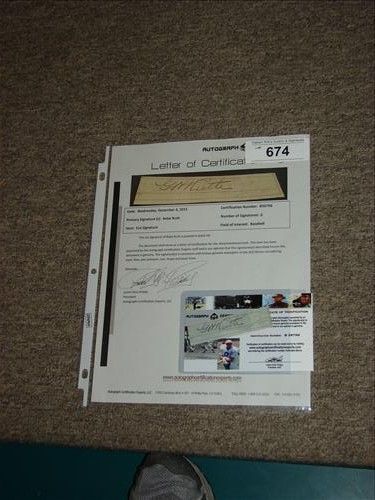 G.H. RUTH CUT SIGNATURE FROM A CHECK. MEASURES 3" X 1". CUT SIGNATURE COMES WITH LETTER OF CERTIFICATION AND CERTIFICATE OF VERIFICATION #B36756 FROM ACE (AUTOGRAPH CERTIFICATION EXPERTS). AS SHOWN. VIEW PICTURE FOR DETAIL.