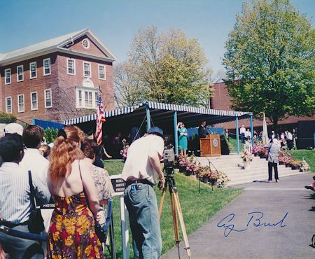 (b. 1924) 41st President of the United States (1989–93). He had previously served as the 43rd Vice President of the United States, a congressman, an ambassador, and CIA Director. Pair of S.P.'s, 8" x 10", color, most probably as president. Bush is receiving an honorary degree from a university. Fine.